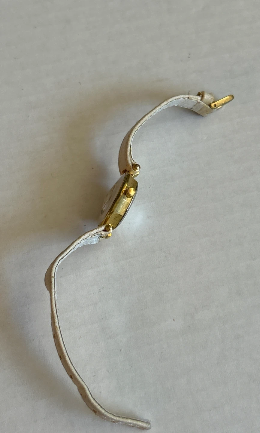This is a Vintage Ronca quartz watch. It's water-resistant with a white leather band. The watch features a gold-tone. Battery needs replacing.