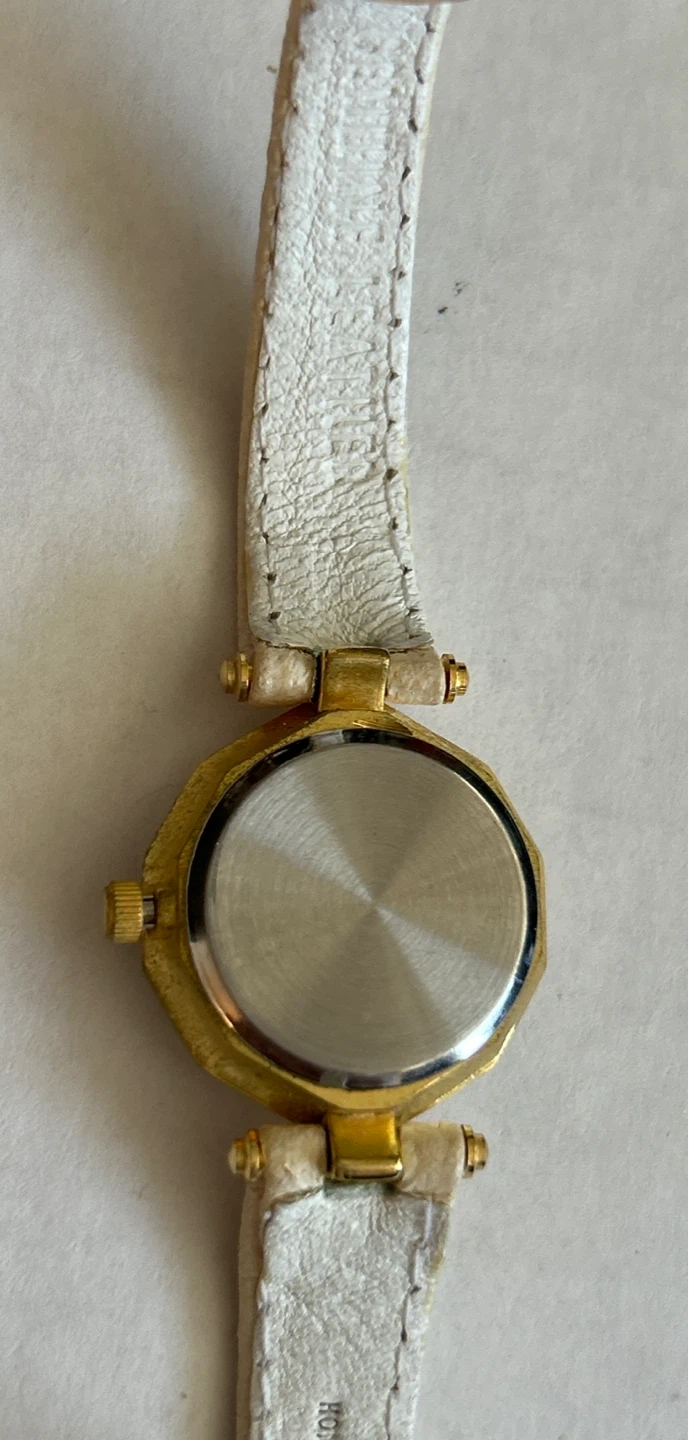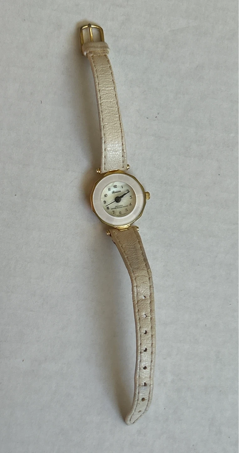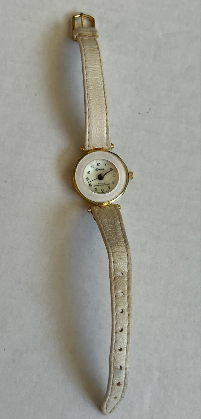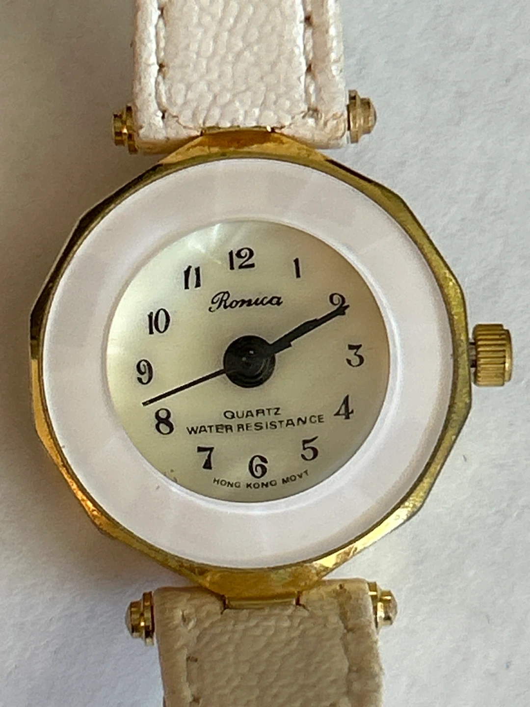 This is a Vintage Ronca quartz watch. It's water-resistant with a white leather band. The watch features a gold-tone. Battery needs replacing.