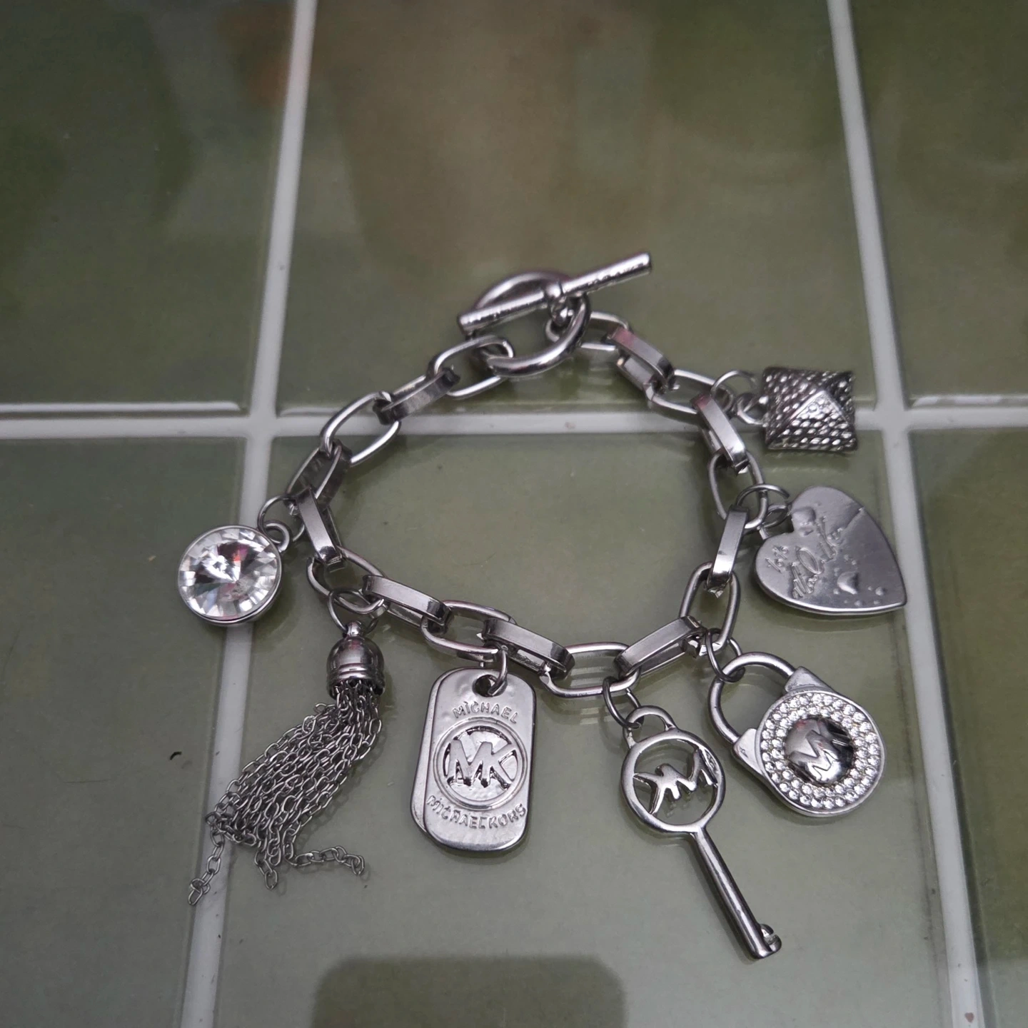 This is a silver-toned Michael Kors charm bracelet. It features a toggle clasp and multiple charms including a padlock, key, tag, heart, tassel, and a crystal accent. The charms have intricate detailing.