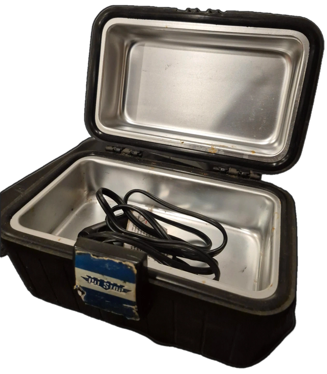 This vintage Pit Stop lunch box is great for keeping food warm on the go. It's a portable food warmer with a black plastic exterior and a silver-tone interior. Includes power cord.