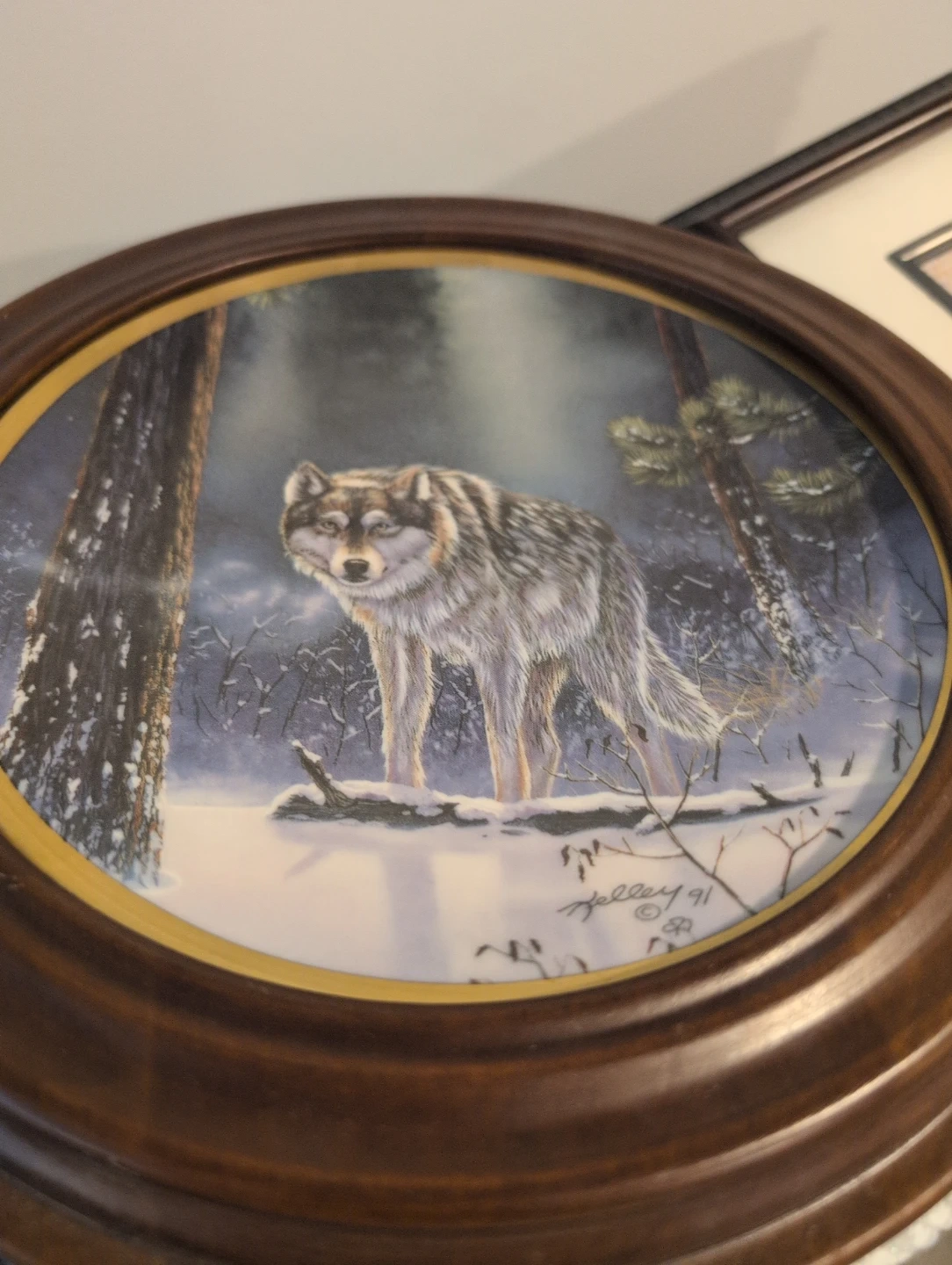 This collector plate features a stunning wolf in a snowy forest scene, signed Kelley '91. It's framed in a decorative wooden rim. It's a beautiful piece for wildlife art enthusiasts!