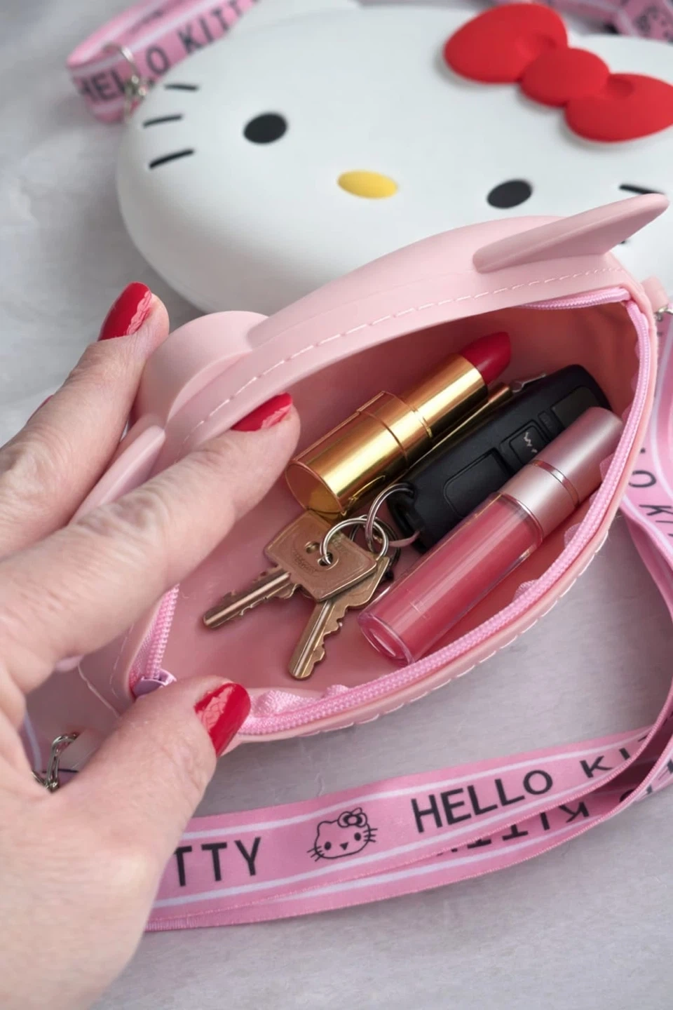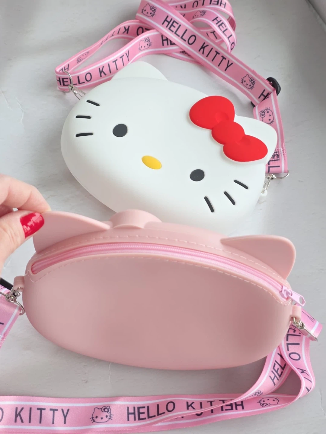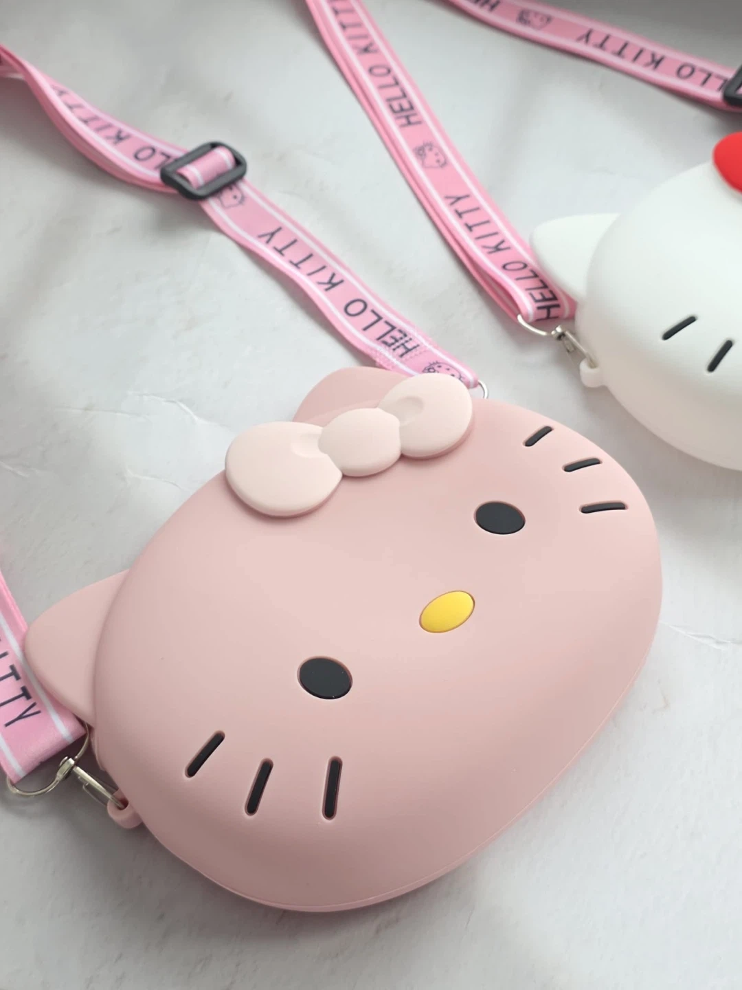 Cute pink Hello Kitty silicone crossbody bag! It's perfect for carrying small essentials. Made of durable silicone material.