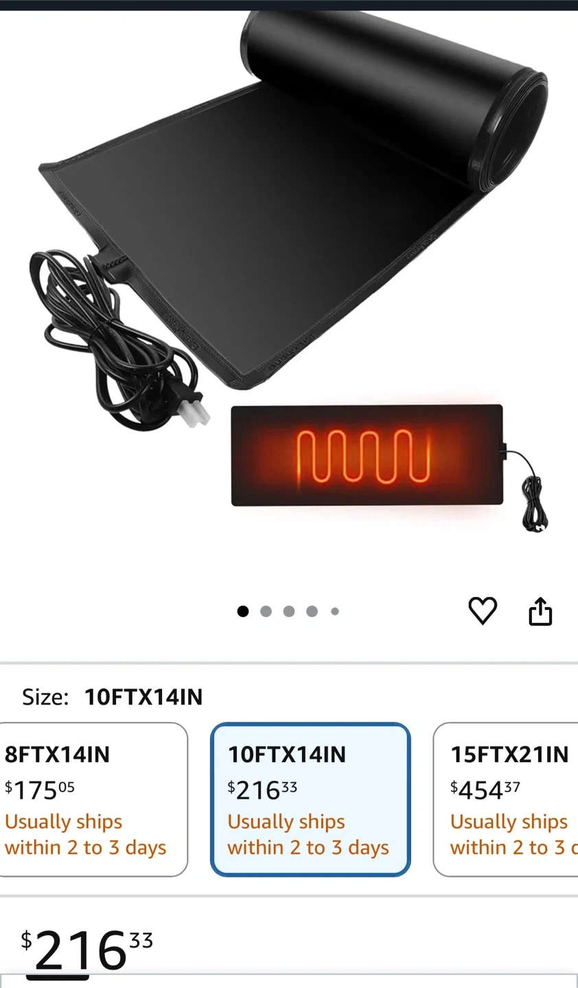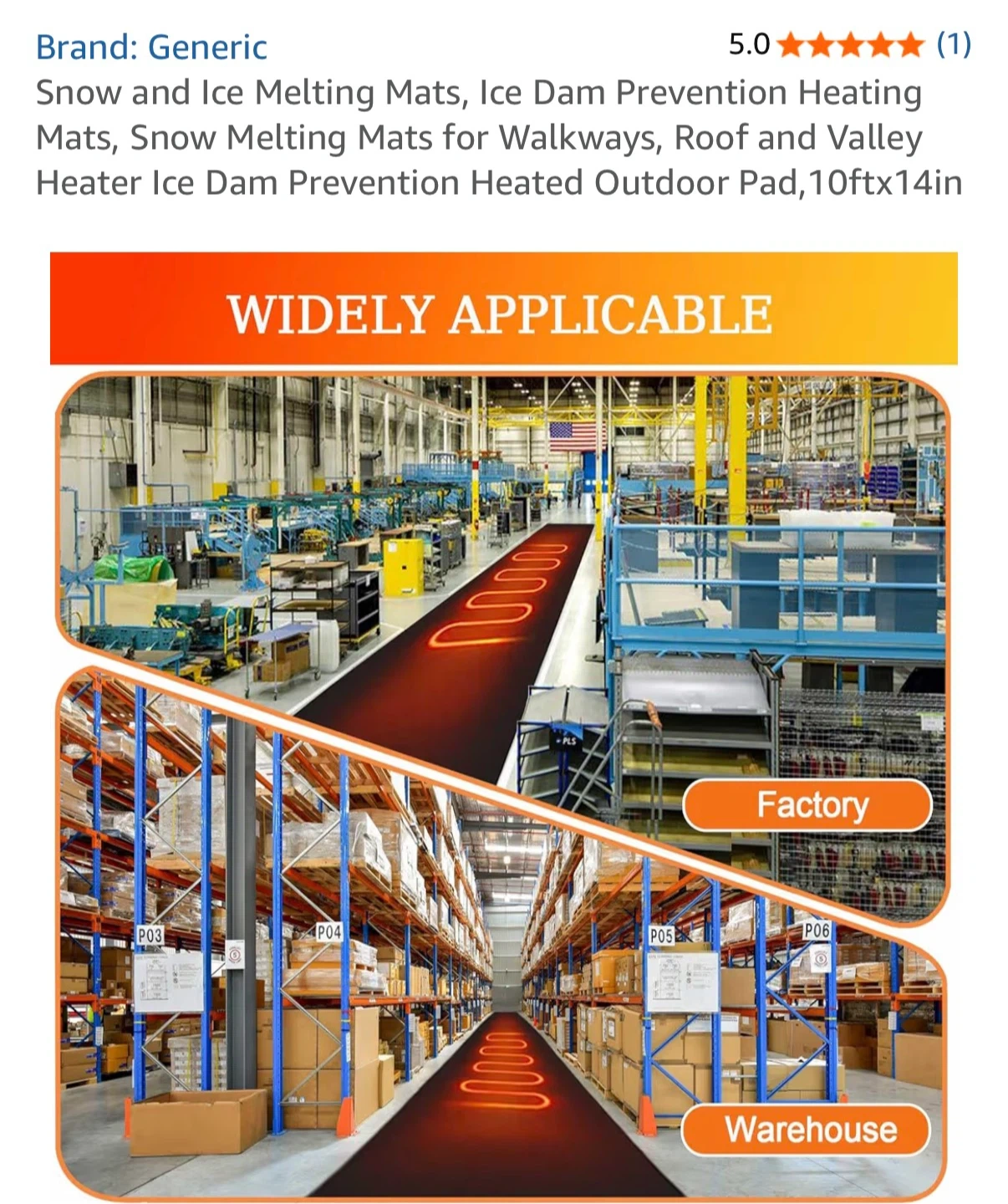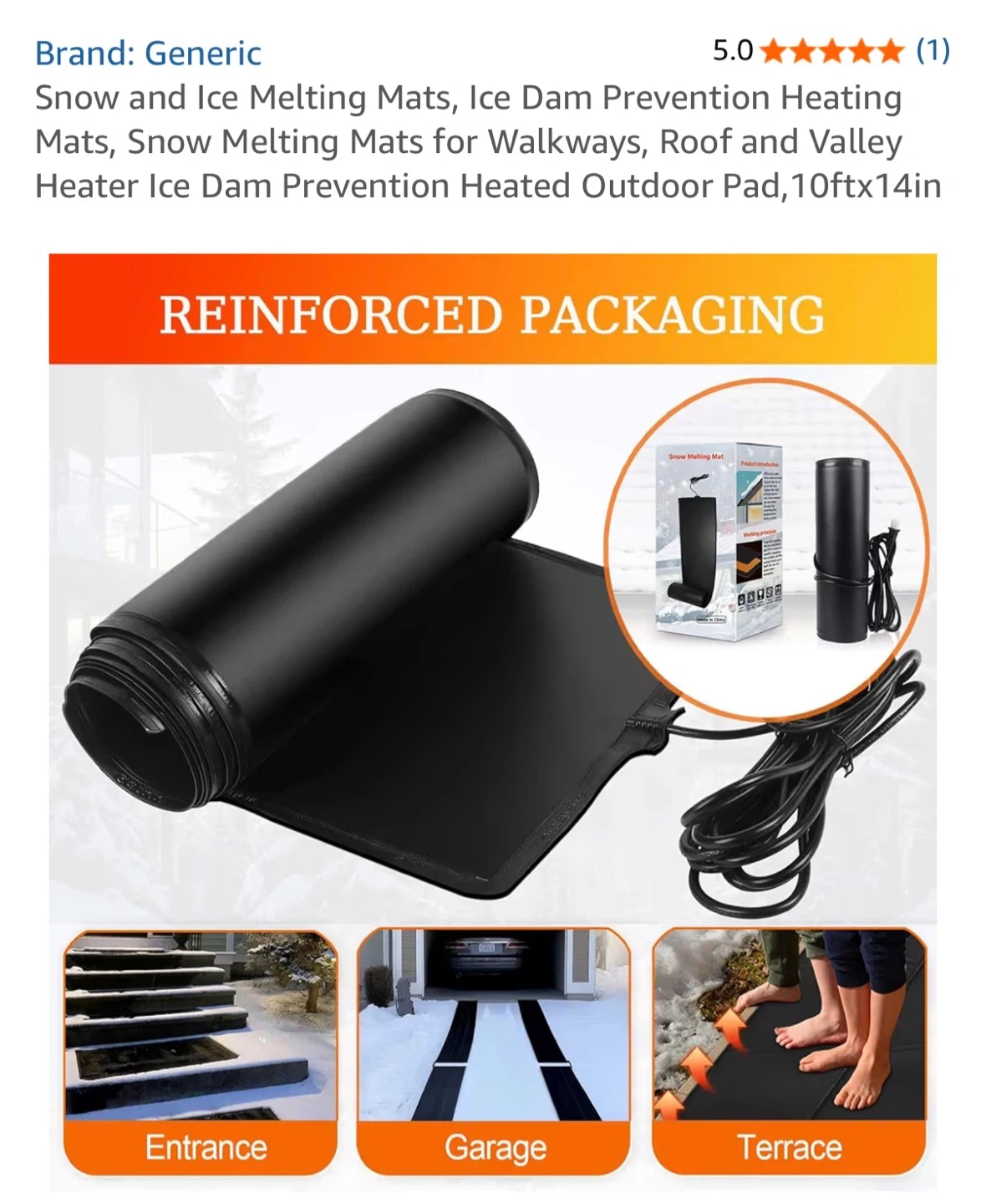 I have a snow and ice melting mat for sale! It's 10 feet by 14 inches. It is widely applicable and can be used in factories, warehouses, tool rooms, and garages, on the edge of your room to prevent ice damming. It has a built in GFCI which most don’t. It is waterproof, eco-friendly, and plug-and-play