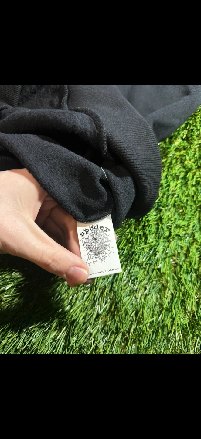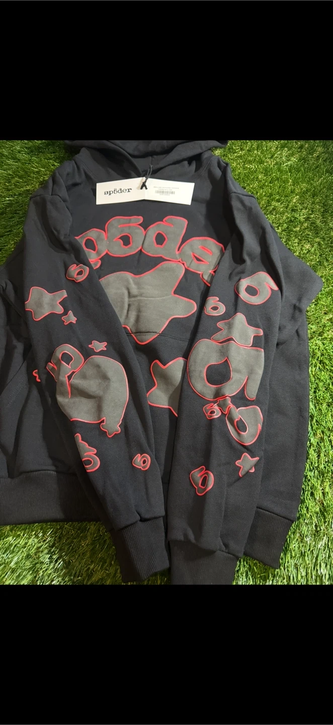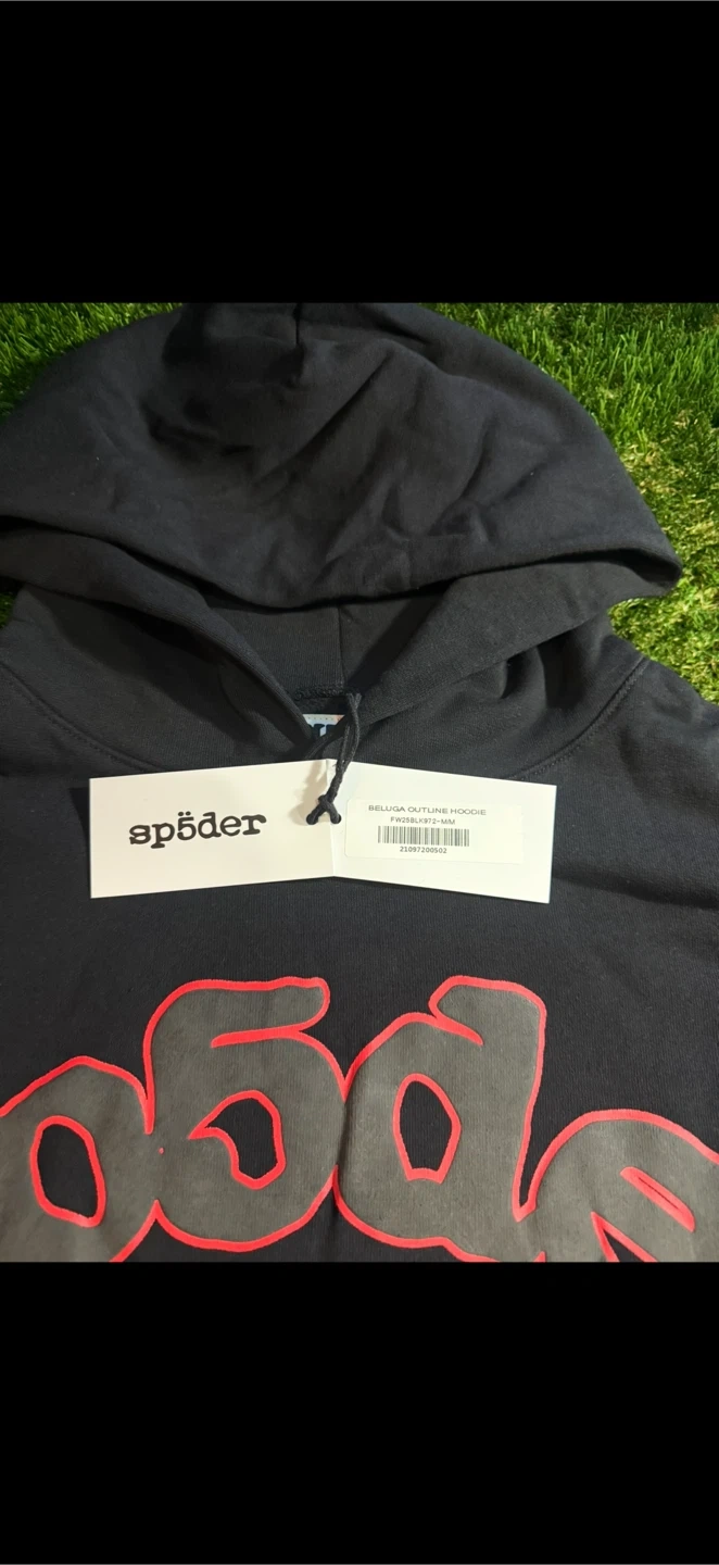 This is a black Sp5der hoodie with a Belluga Outline design. It features a graphic print on the front and sleeves. The hoodie is made of a comfortable fabric. It's a stylish piece for casual wear.