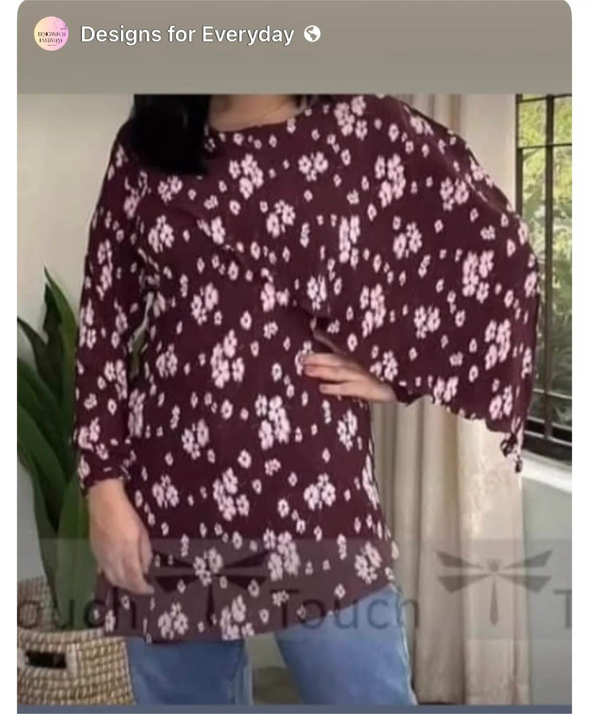Here's a cute floral print top from Designs for Everyday. The burgundy colour with white floral patterns makes it a stylish piece for any casual occasion. It features long sleeves and a comfortable fit.