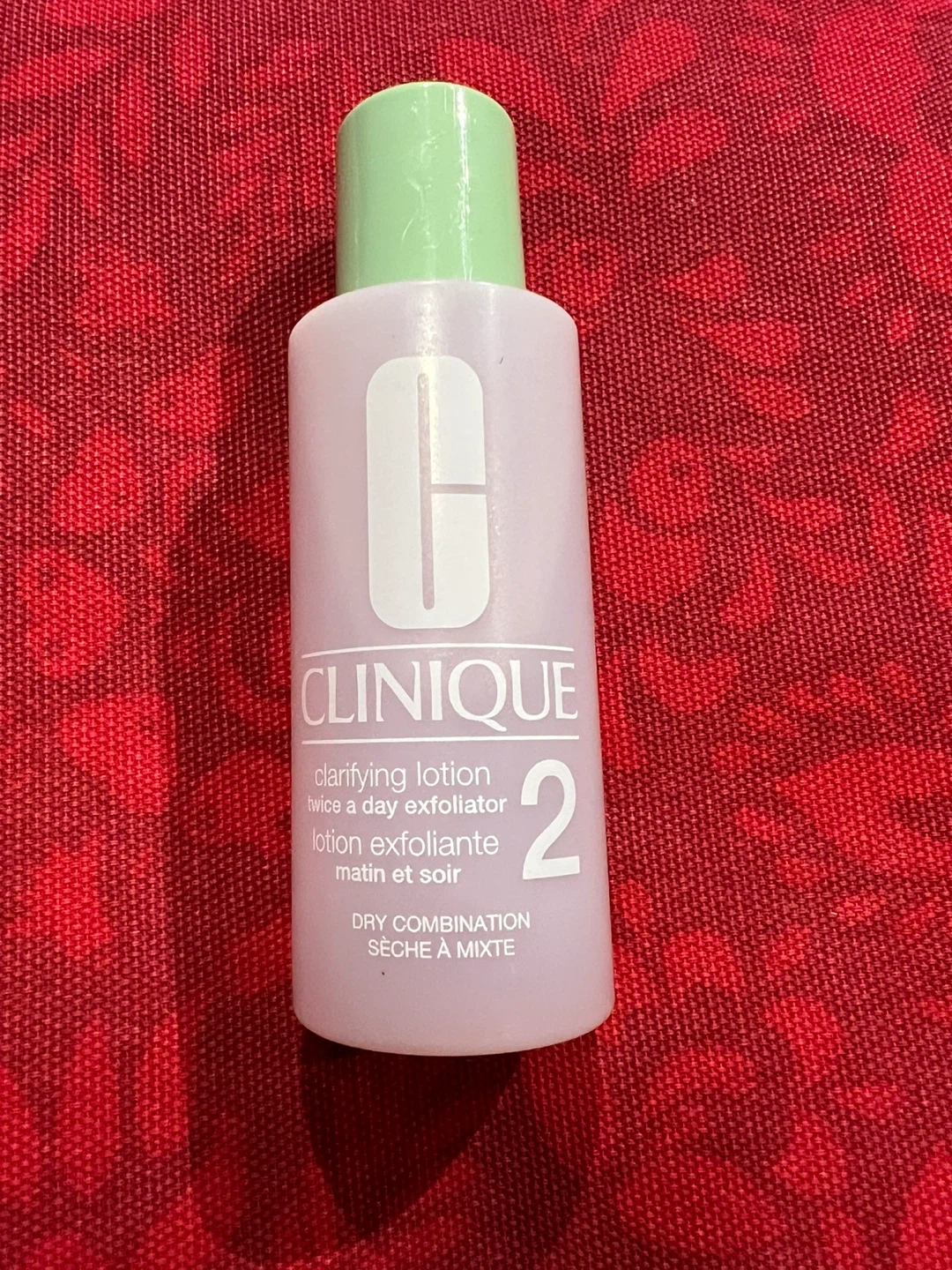 This is Clinique Clarifying Lotion 2, a twice-a-day exfoliator. It's formulated for dry combination skin. The bottle contains 60 ml of product.