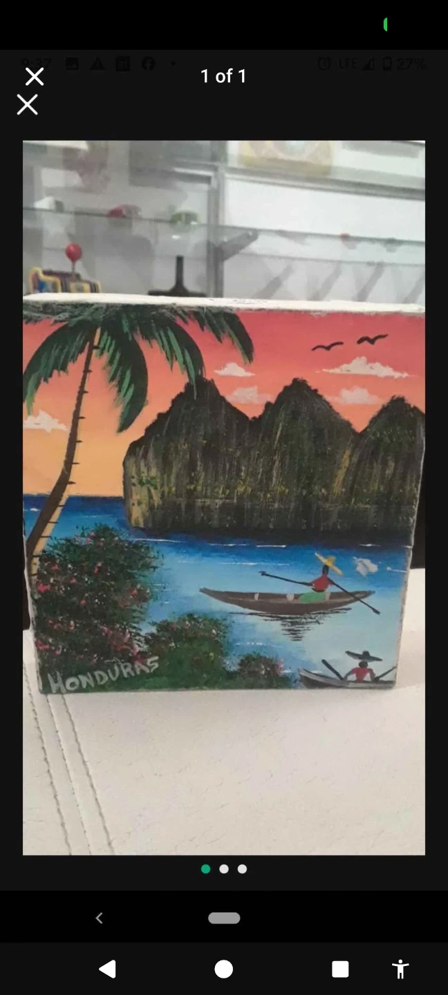 This unique block features a vibrant hand-painted tropical landscape scene with a palm tree, mountains, and people in canoes. The word "Honduras" is visible on the front. It's a decorative piece that brings a touch of paradise!