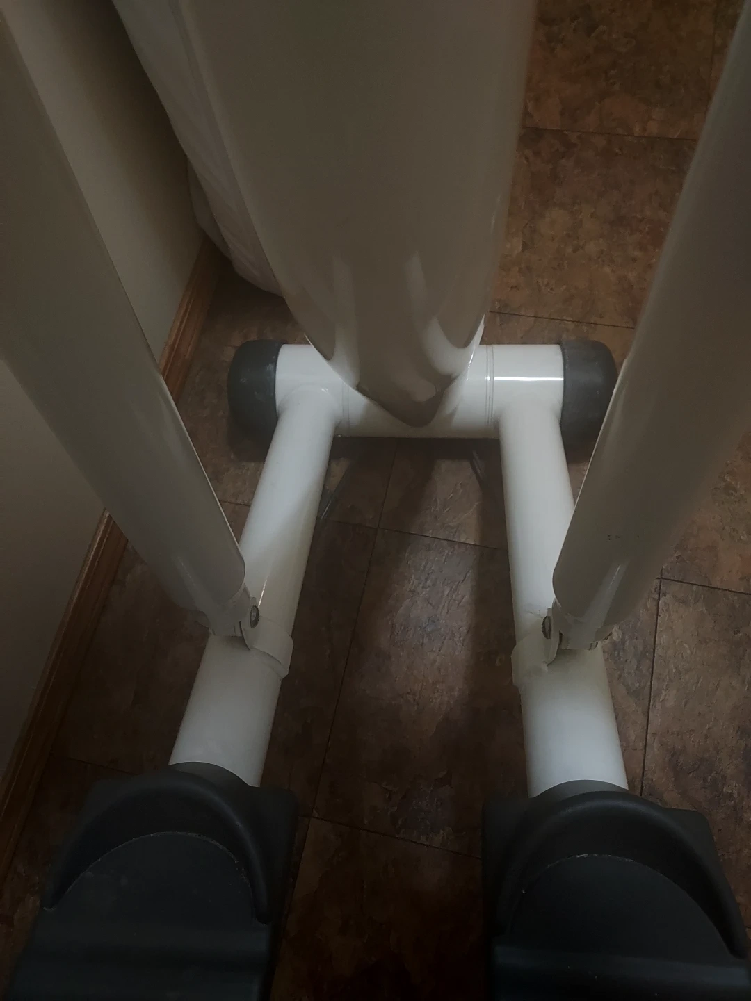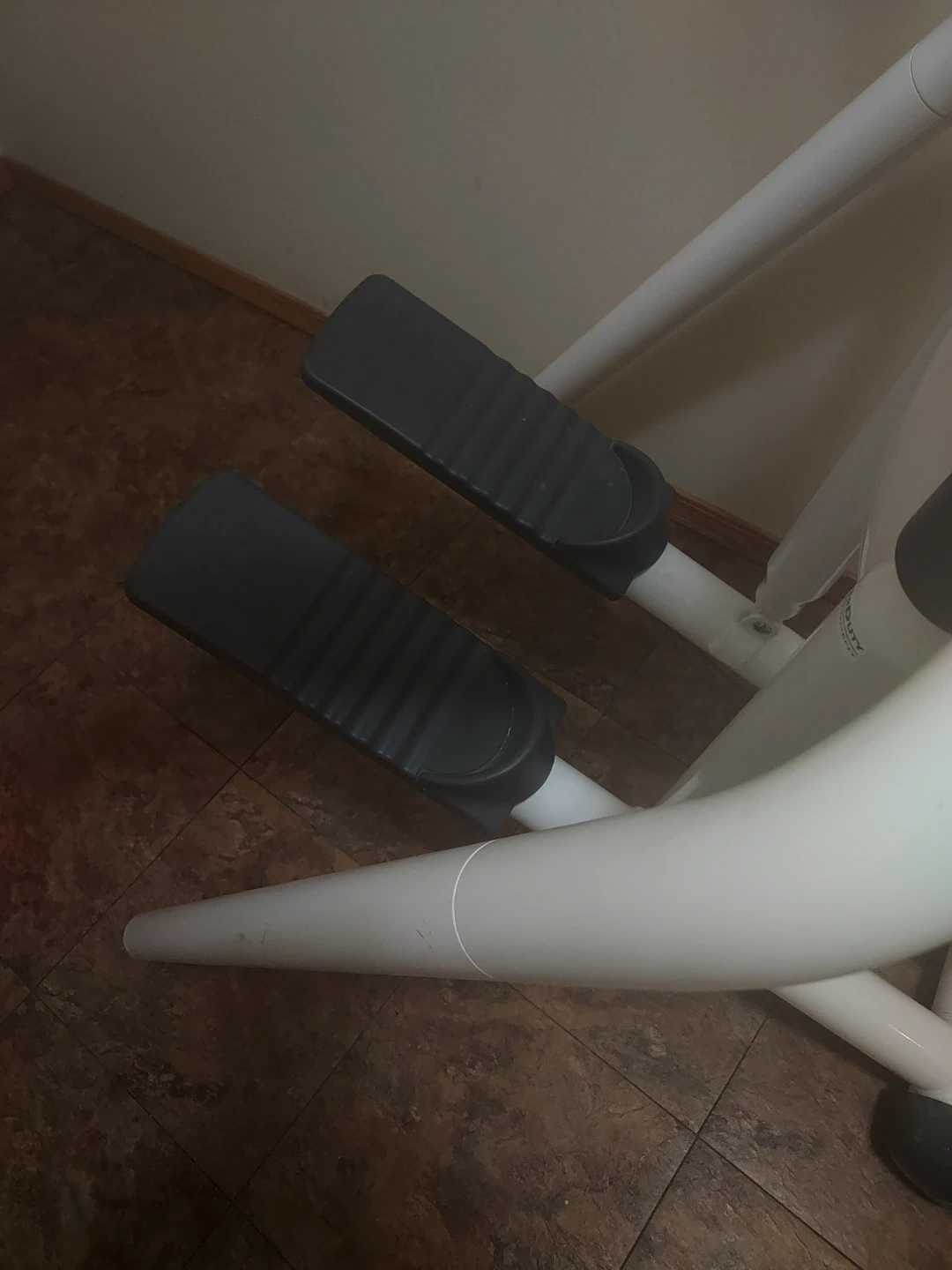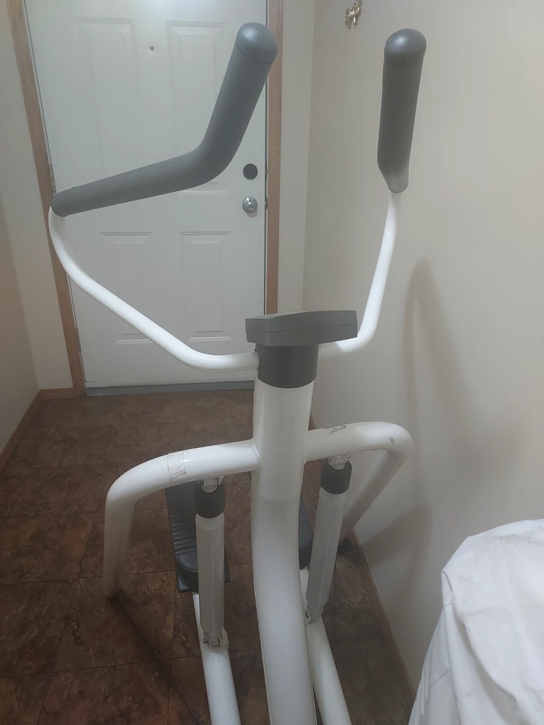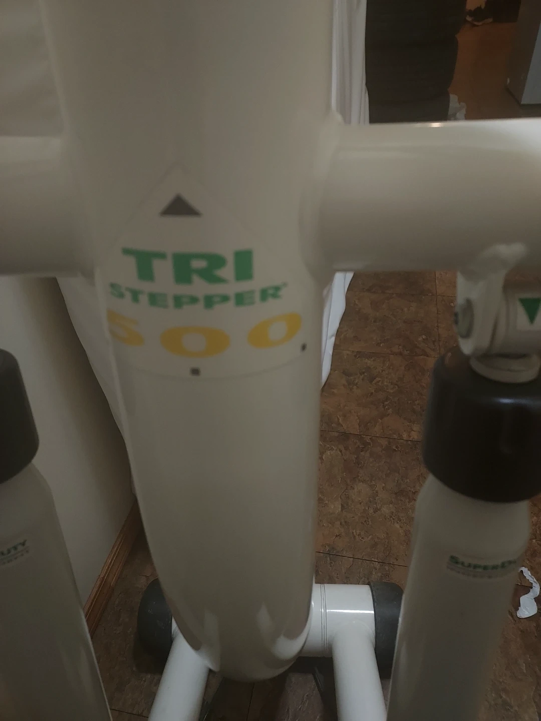 This is a Tri Stepper 500 machine. It's white with grey handle grips. It's a compact exercise machine. In excellent condition.