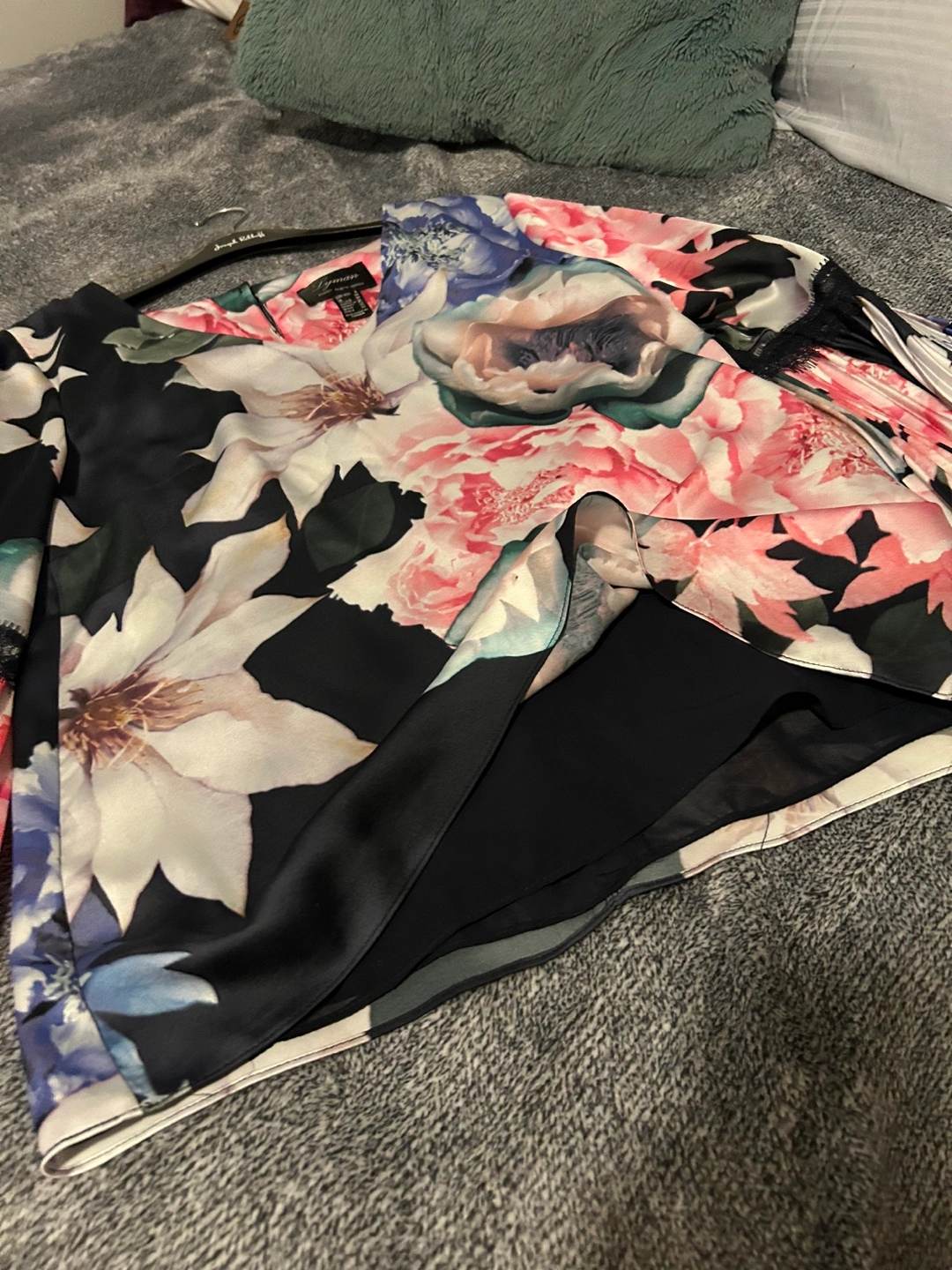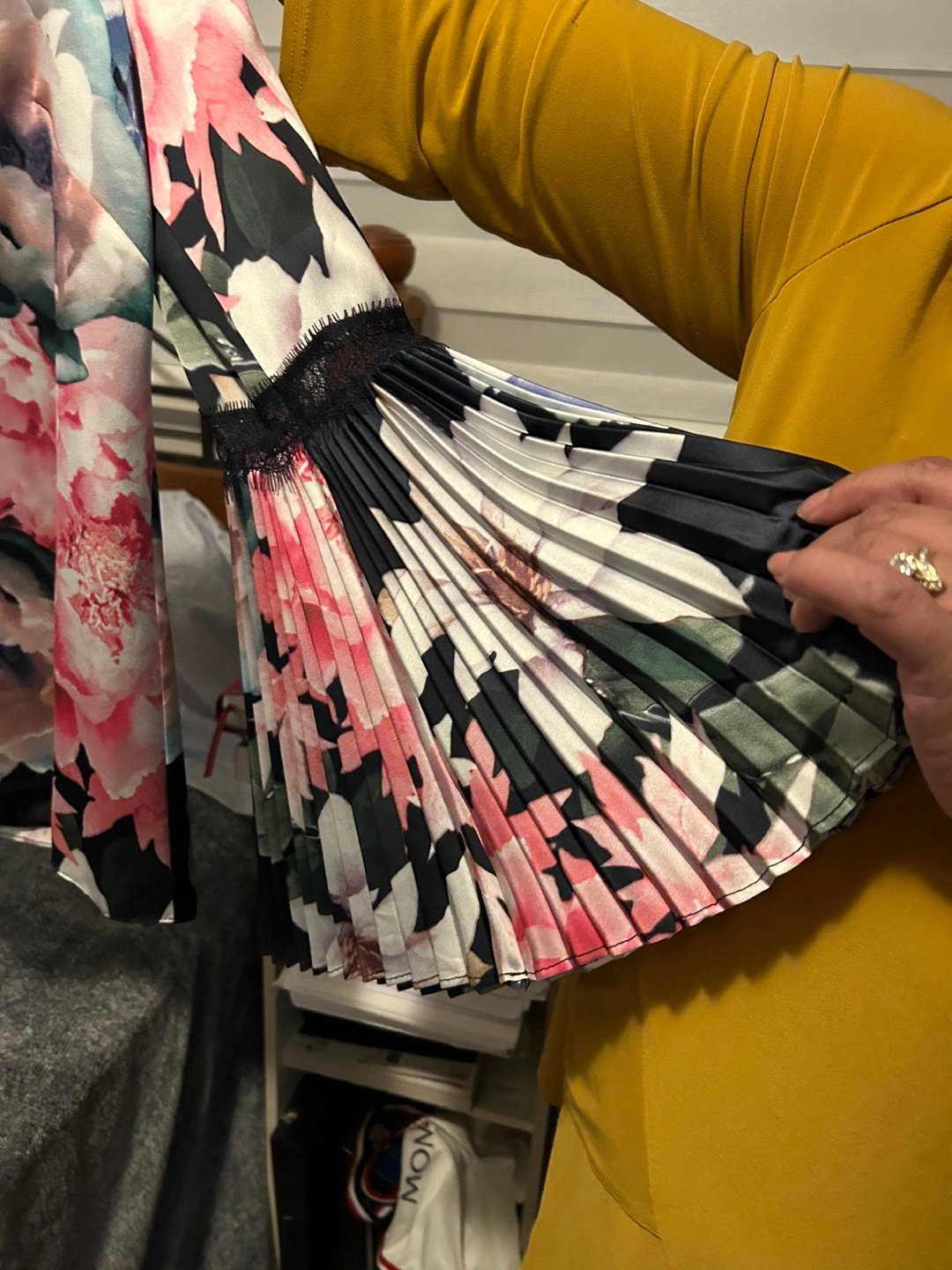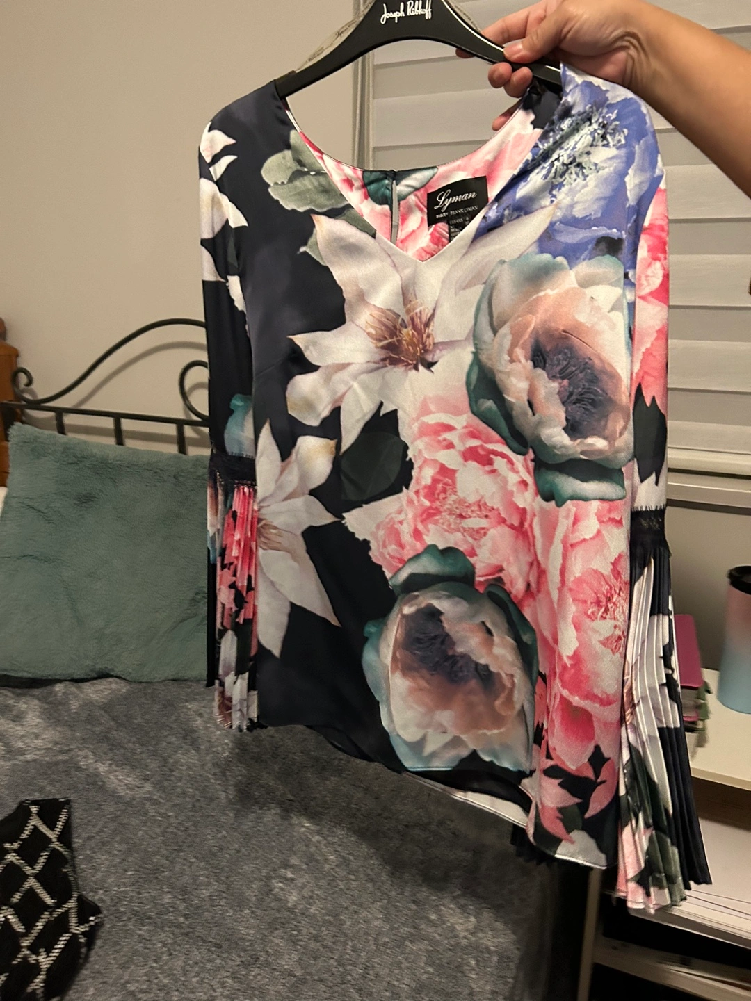 Long sleeve, black floral blouse with pleated sleeves and lace trim. V-neck.
