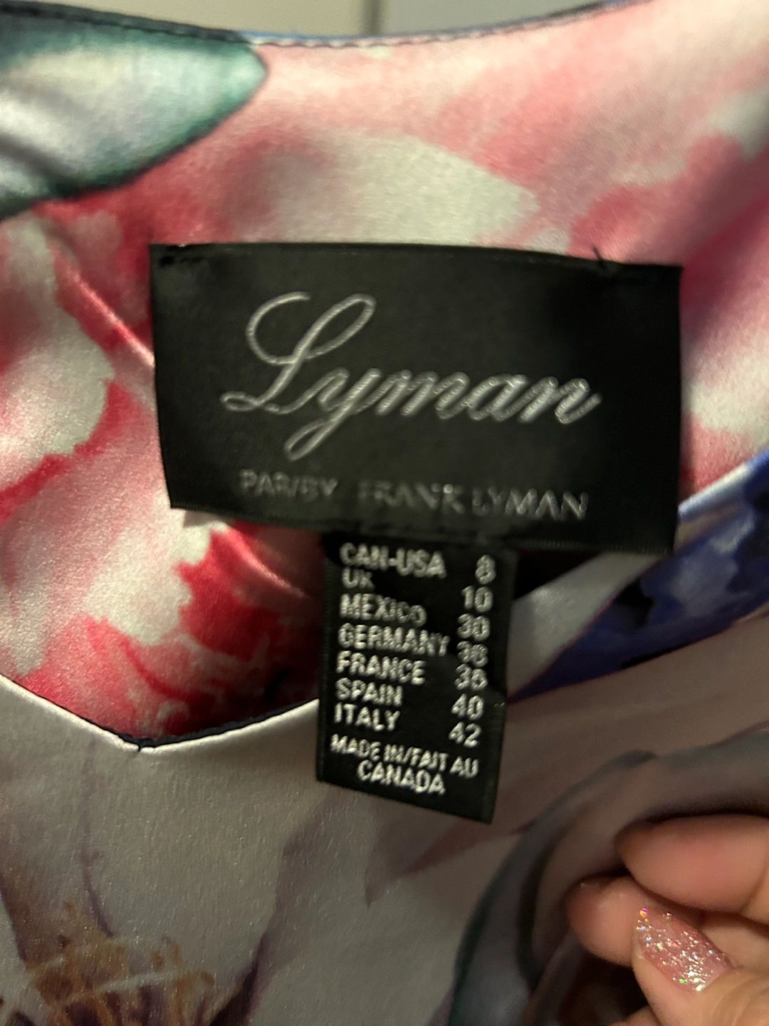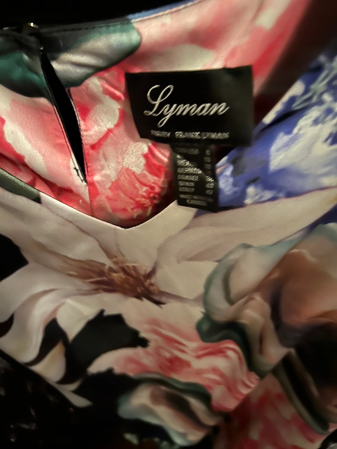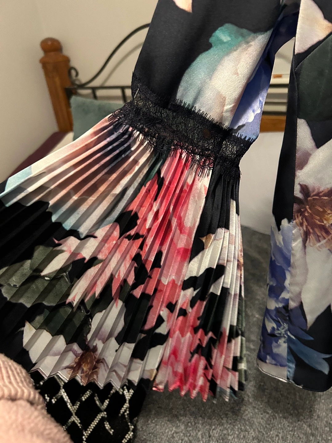 Long sleeve, black floral blouse with pleated sleeves and lace trim. V-neck.