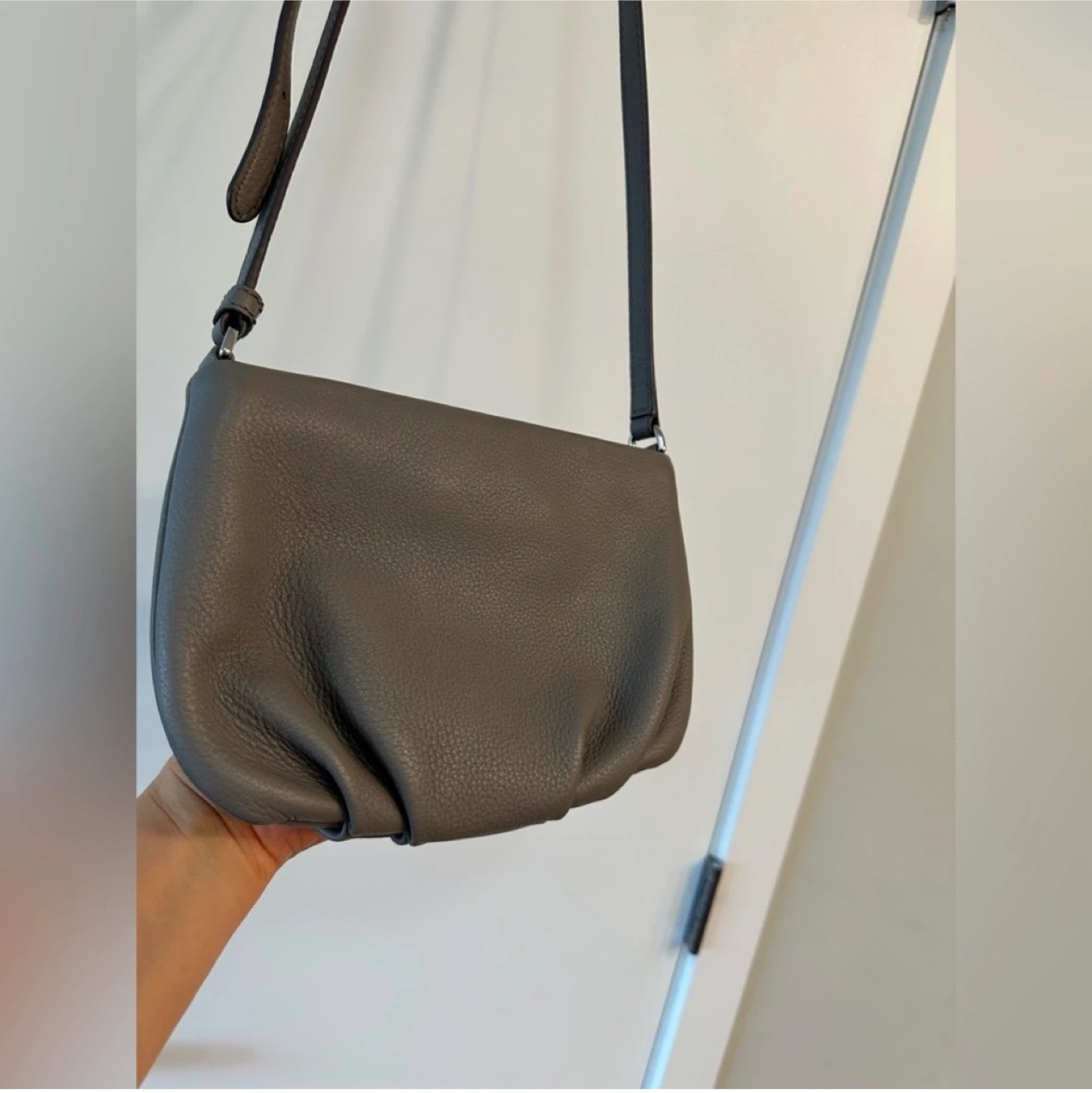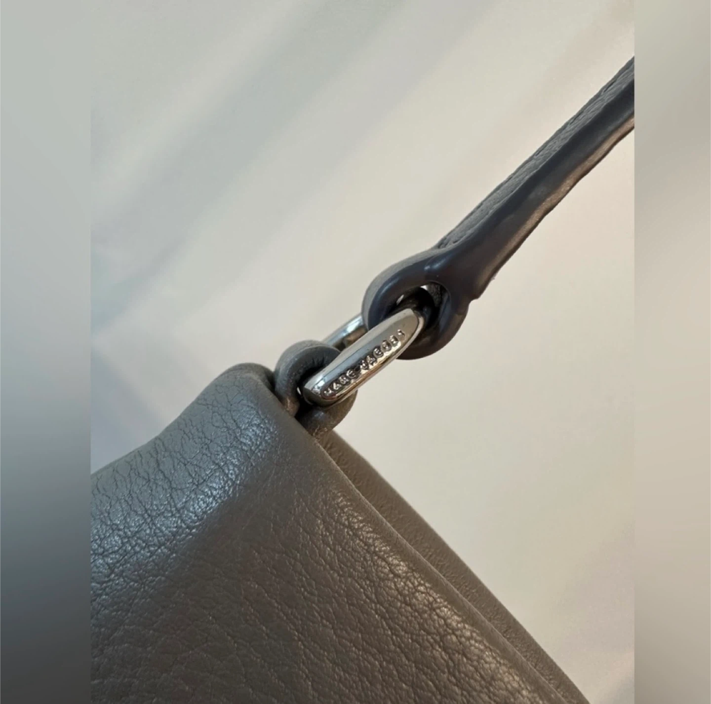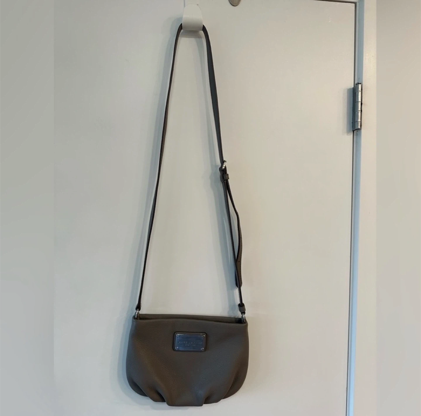 Marc Jacobs grey pebbled leather shoulder bag. It's a stylish crossbody with a silver-tone plaque. The bag measures approximately 9x6 inches wide.