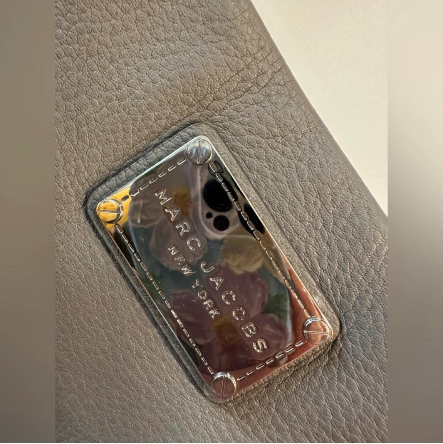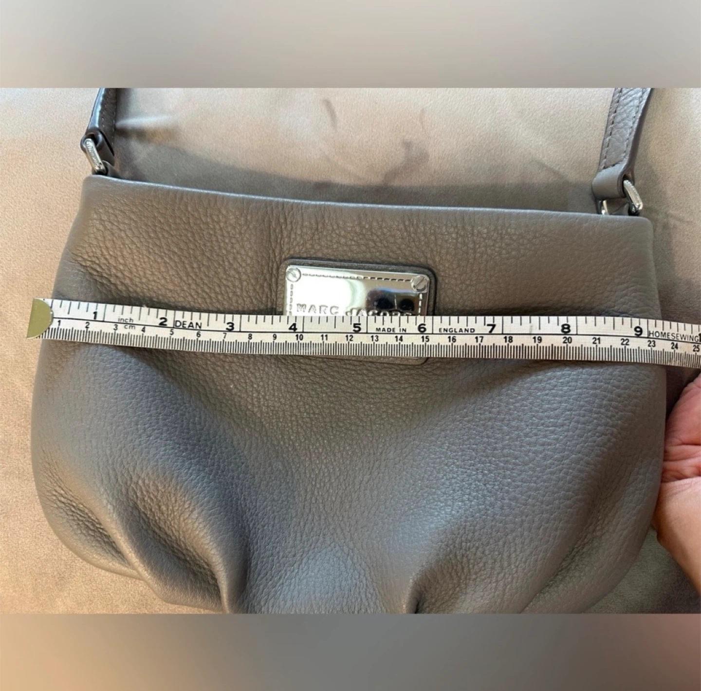 Marc Jacobs grey pebbled leather shoulder bag. It's a stylish crossbody with a silver-tone plaque. The bag measures approximately 9x6 inches wide.