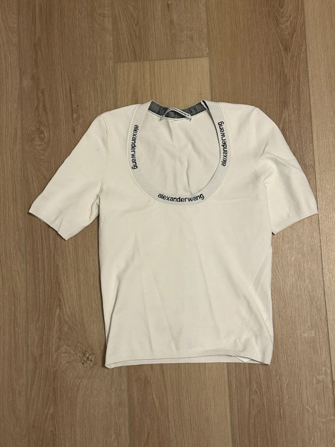 White short-sleeve t-shirt with an Alexander Wang logo detail around the neckline. It's a comfortable and stylish piece for everyday wear. The fabric is soft and breathable.