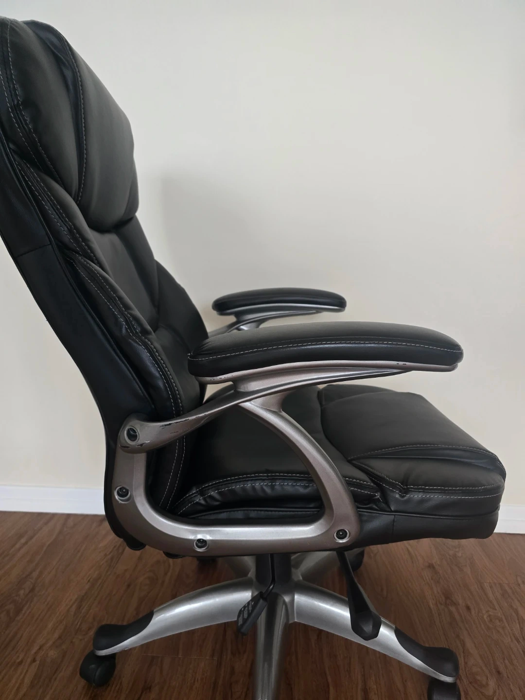 The leather has NO peeling or cracking but there is a minor cosmetic scratch on the side of the armrest frame.