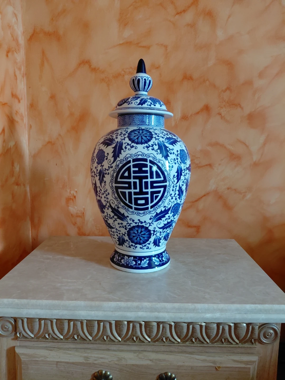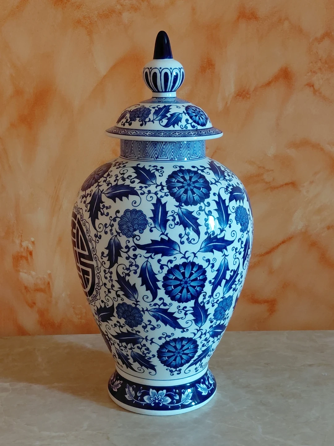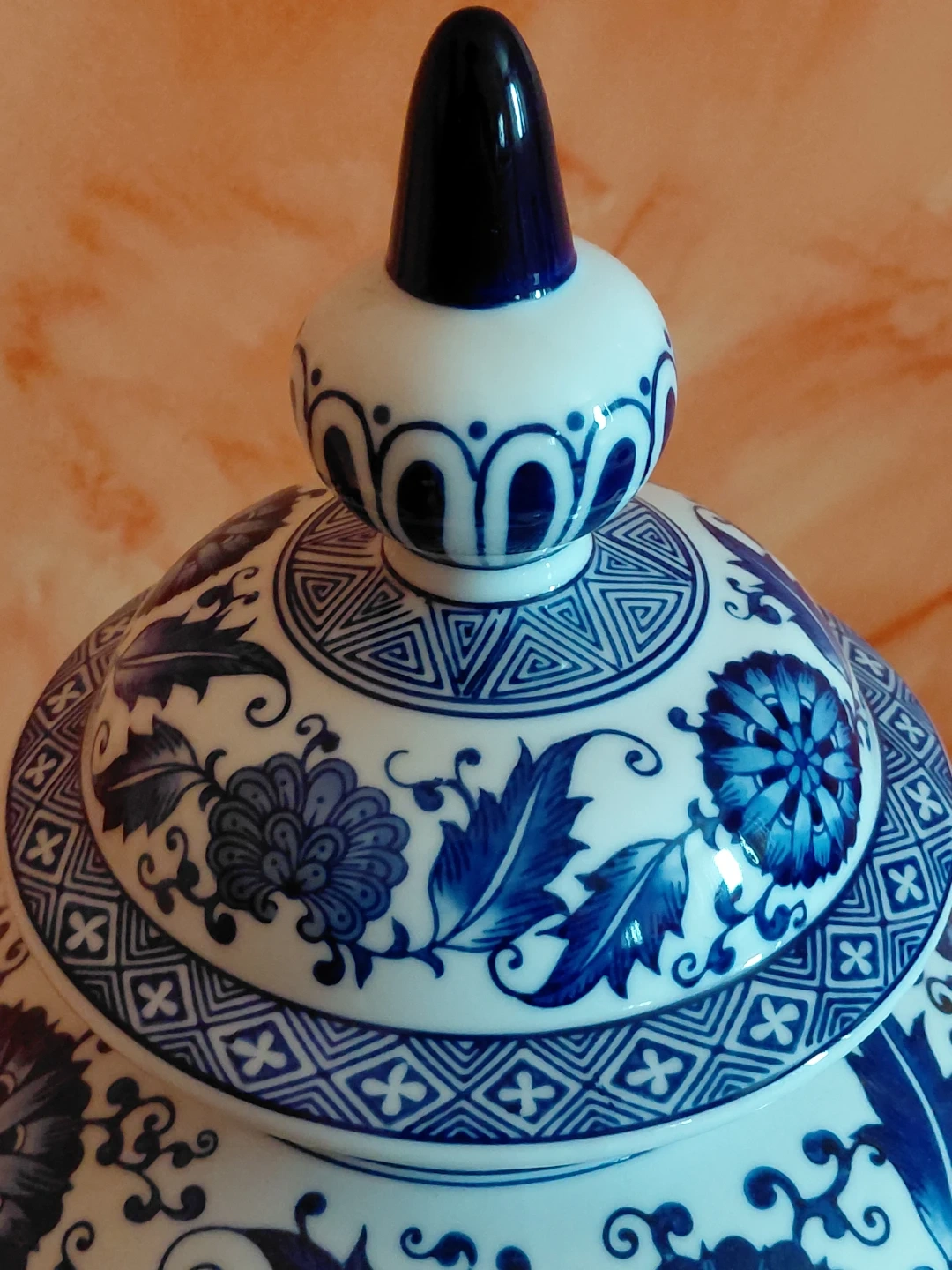This is a large decorative ginger jar with a lid. It features a classic blue and white Chinoiserie floral pattern. The lid has a finial top, and the jar's body is adorned with intricate detailing.