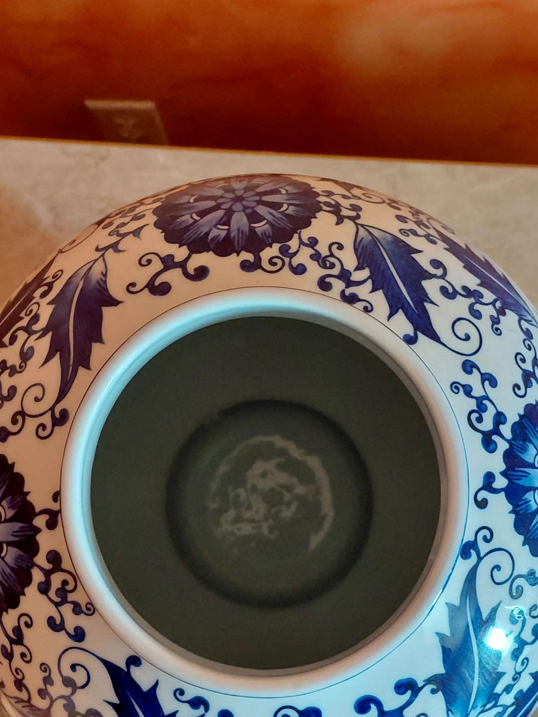 This is a large decorative ginger jar with a lid. It features a classic blue and white Chinoiserie floral pattern. The lid has a finial top, and the jar's body is adorned with intricate detailing.