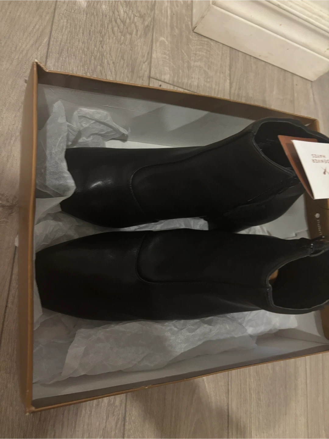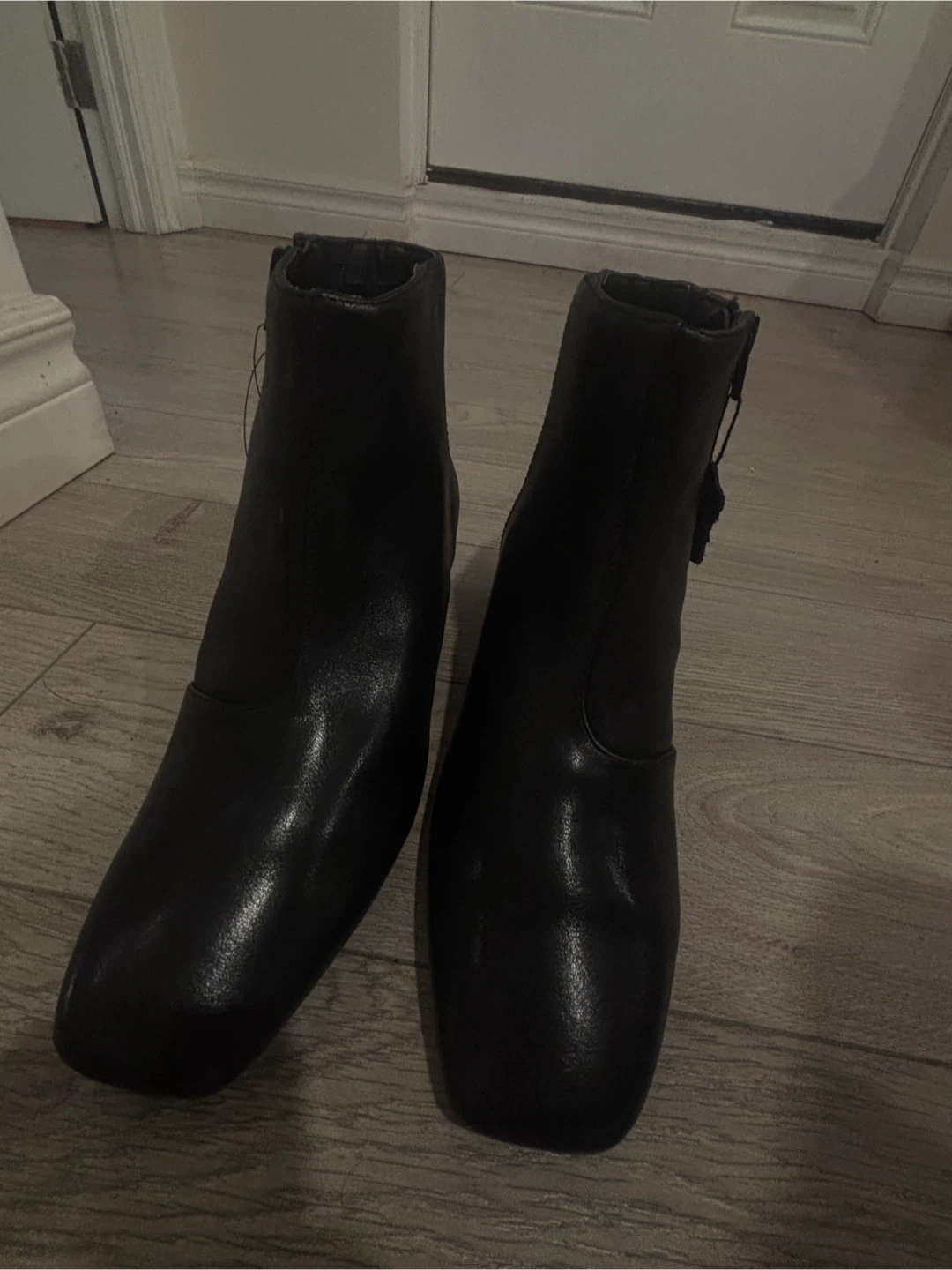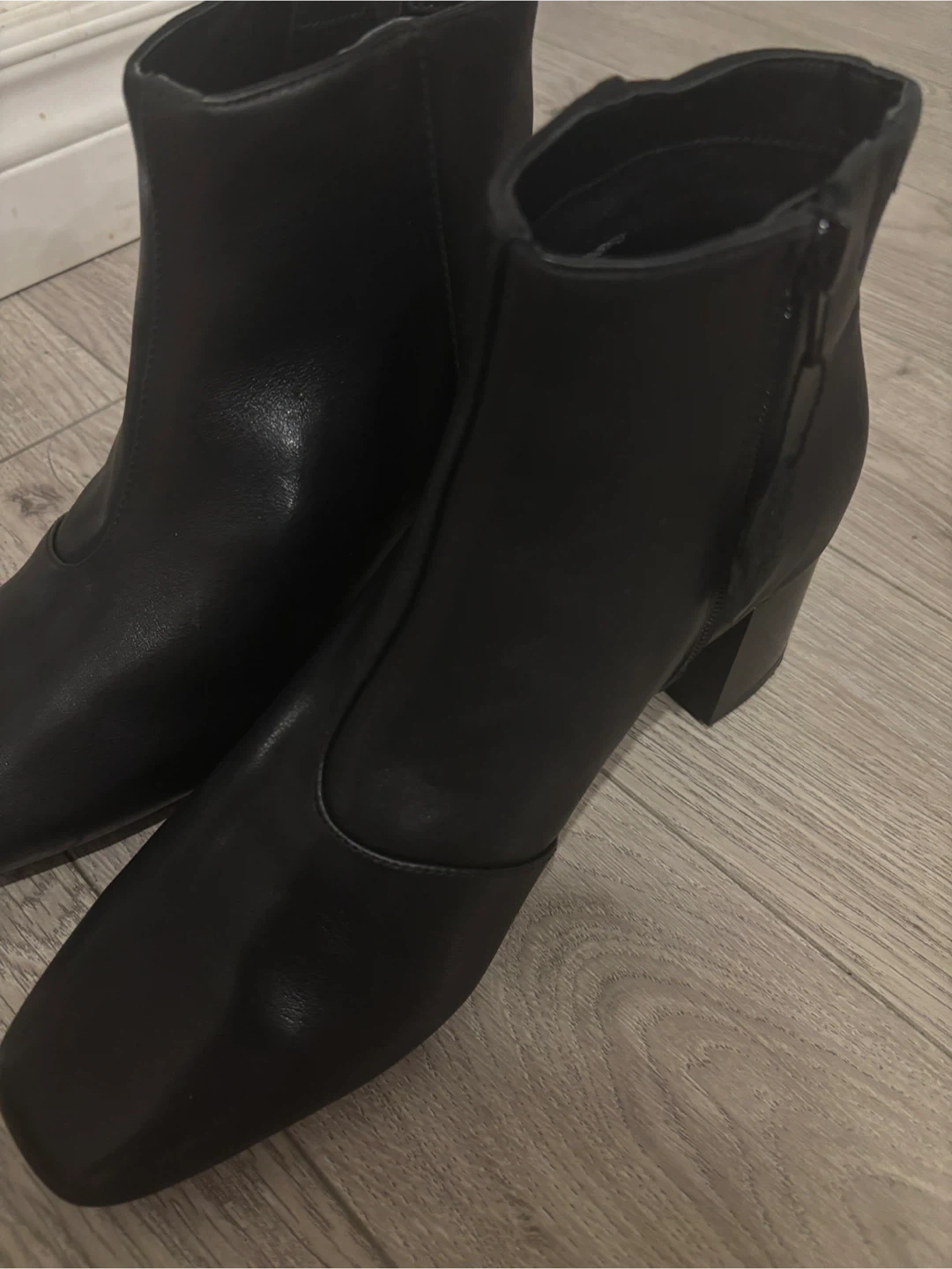 Classic black leather ankle boots. Features a stylish square toe and a comfortable block heel. Includes the original box and tissue paper.
