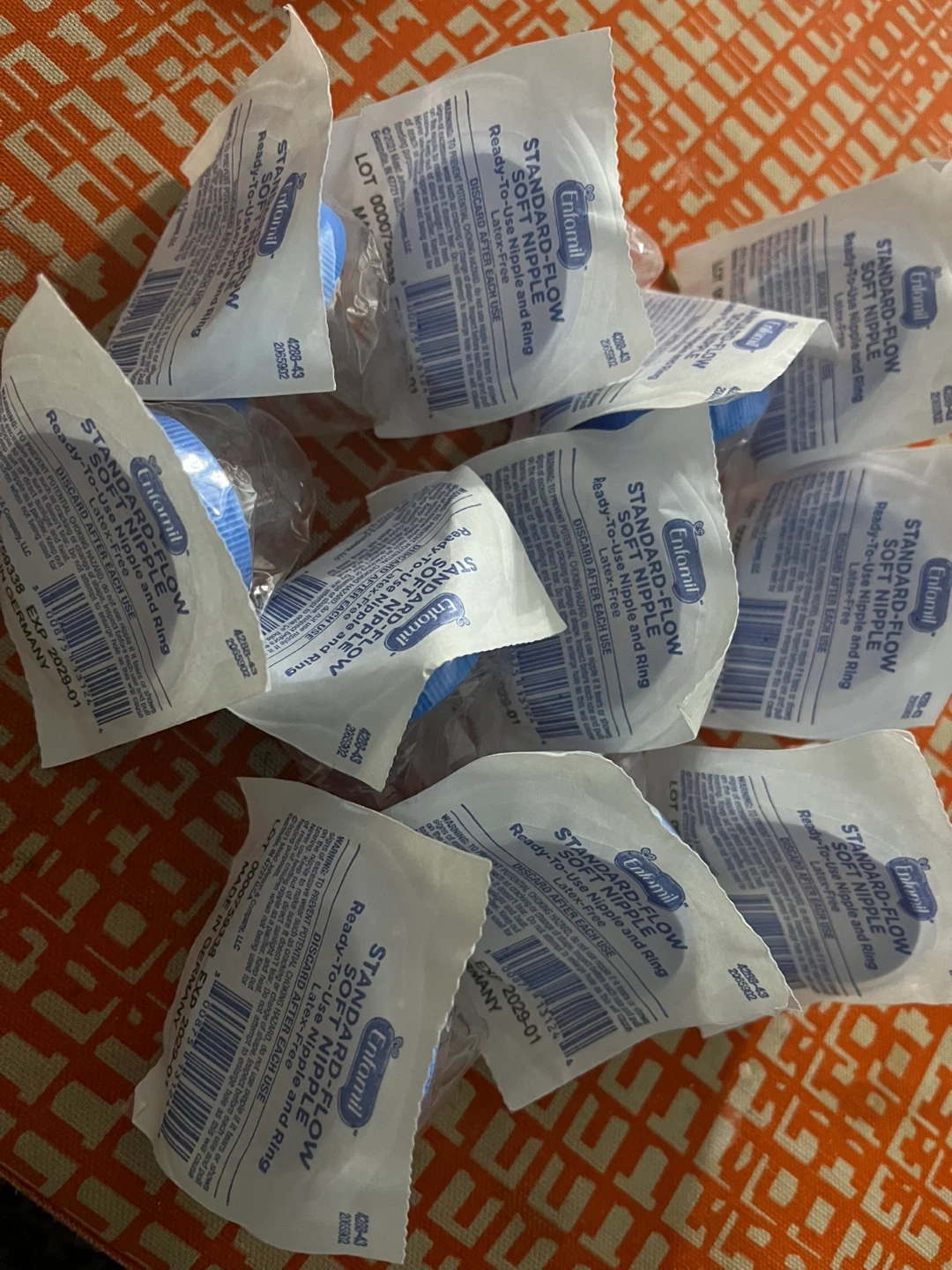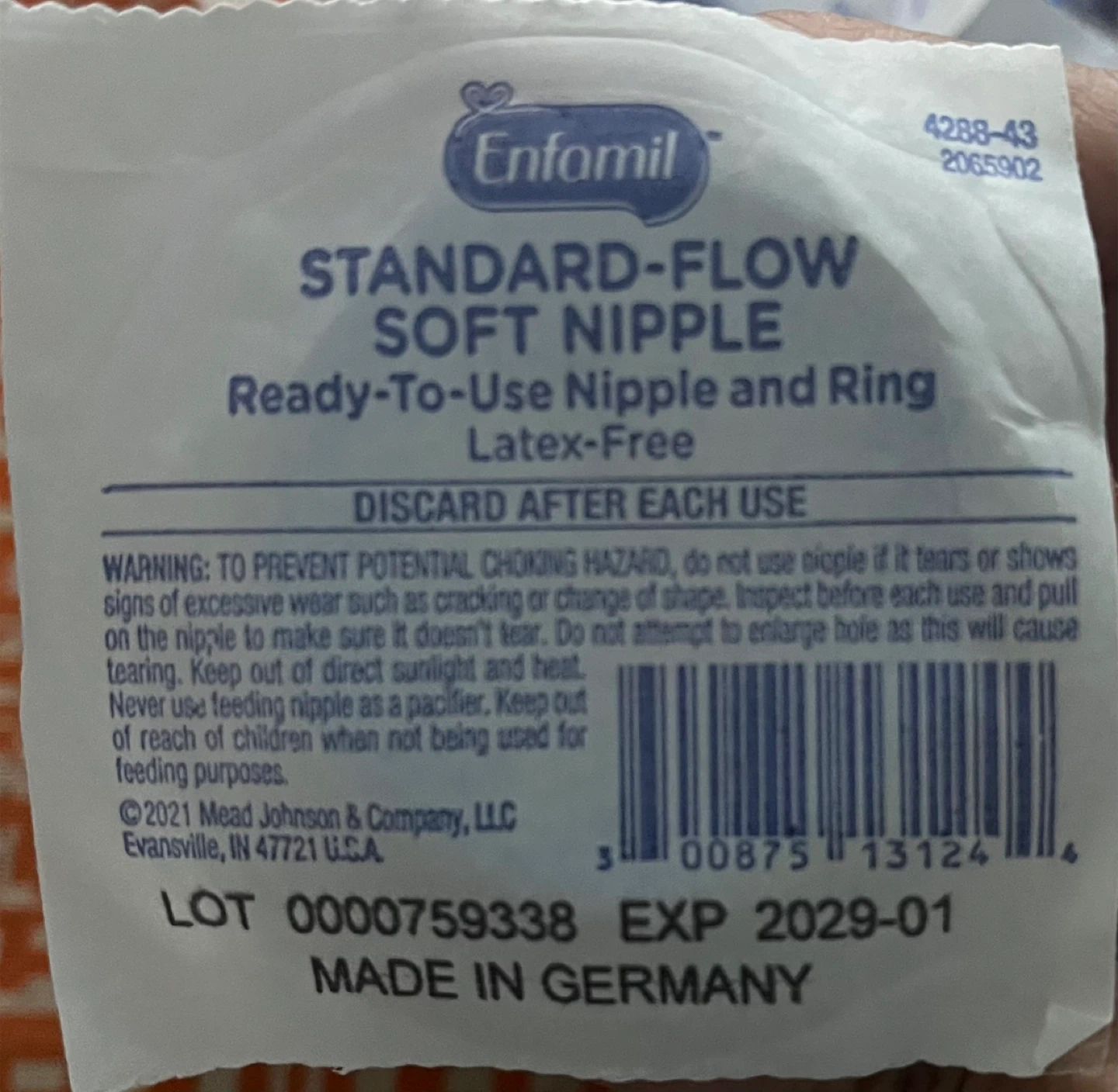 Enfamil Standard-Flow Soft Nipples come ready-to-use with a nipple and ring. These latex-free nipples are made in Germany. They expire in January 2029.