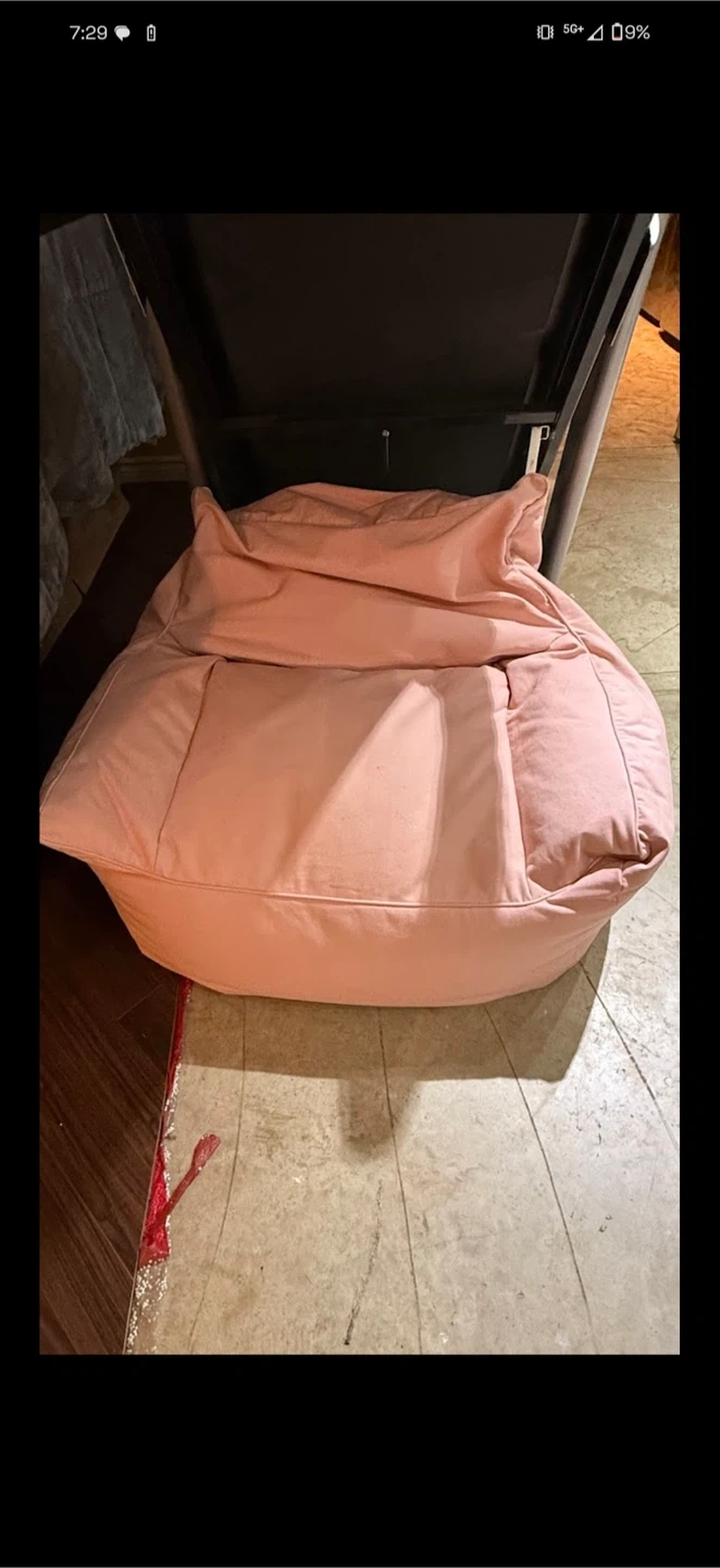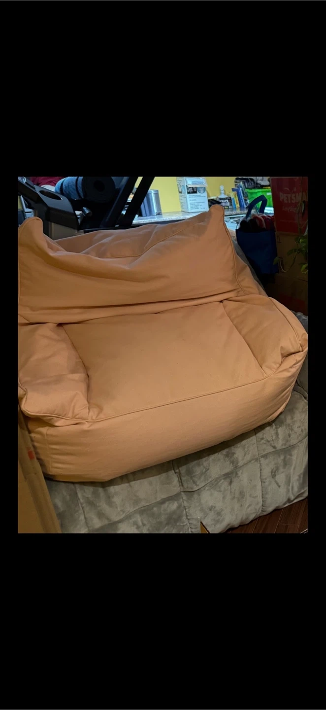 Comfortable peach bean bag chair. Its soft material makes it great for lounging. This chair is perfect for a game room or cozy corner!