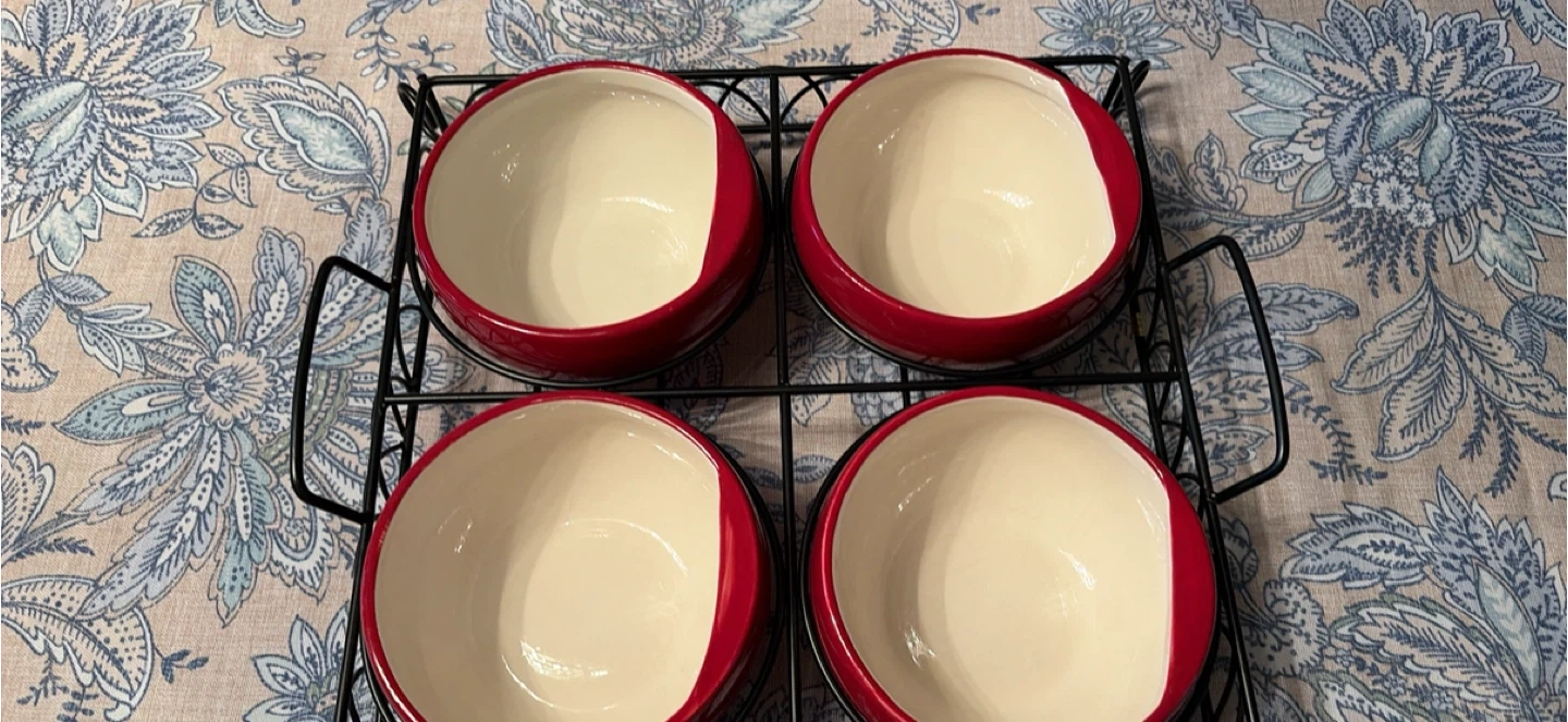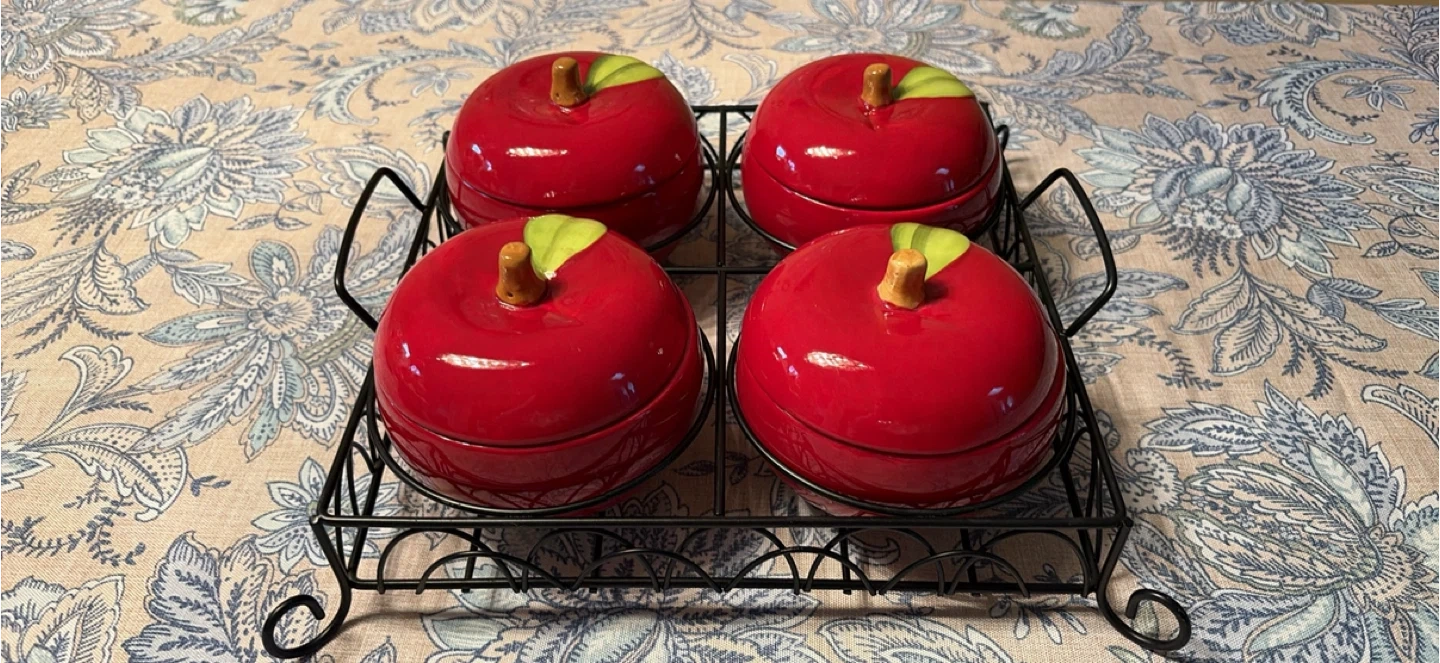 Set of four Temp-tations by Tara ceramic bowls shaped like apples. Model: Fresh Crop. Made in China. These are great for serving small portions of food or for decorative use. In great condition.