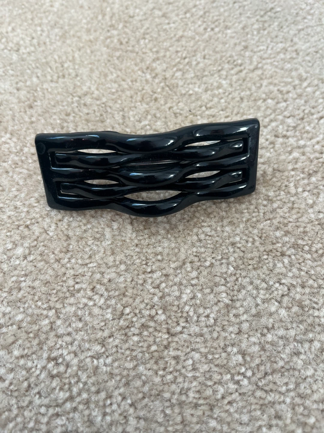 A black barrette hair clip with a decorative cutout design. It measures approximately 3 inches in length. This clip is suitable for securing hair in place.