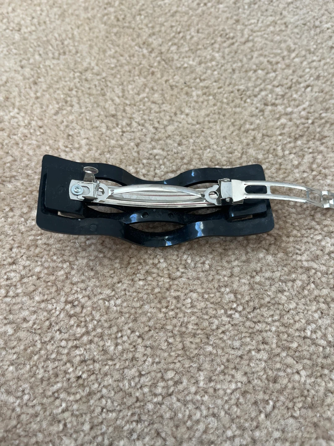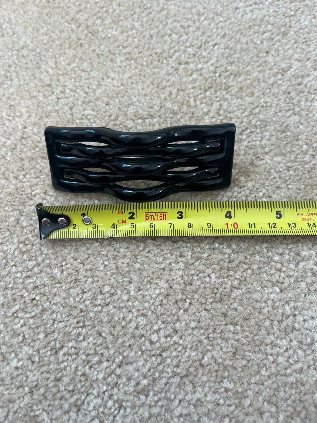 A black barrette hair clip with a decorative cutout design. It measures approximately 3 inches in length. This clip is suitable for securing hair in place.