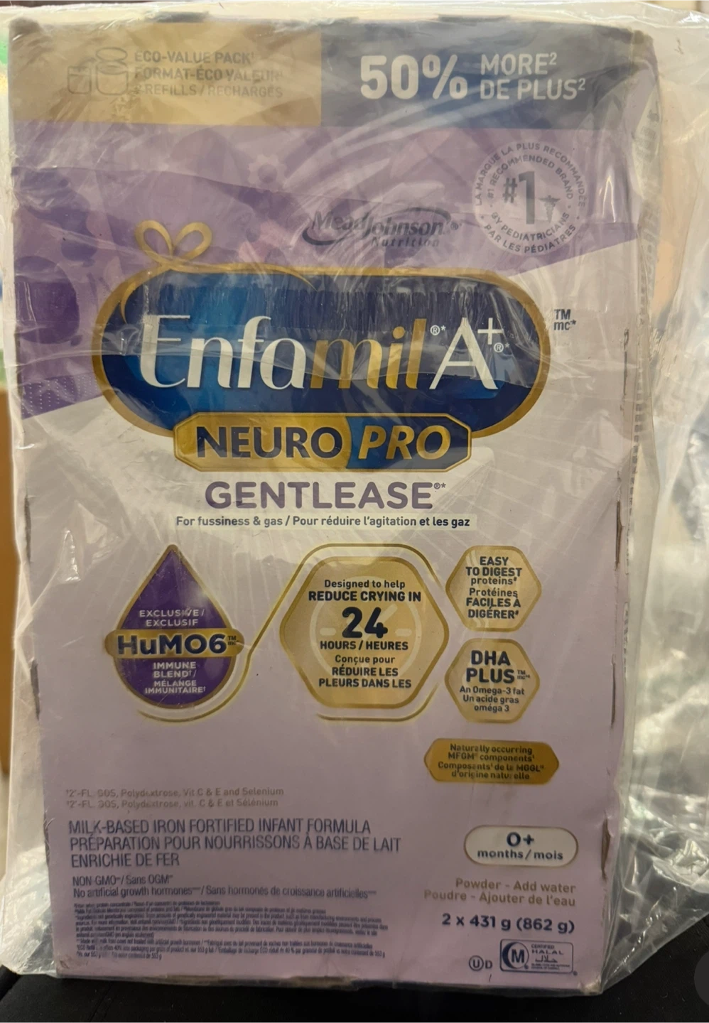 Selling a Enfamil A+ NeuroPro Gentlease baby formula. This powder formula is designed for babies with common feeding issues and is easy to digest. It's suitable for babies aged 0-12 months and contains DHA and HuMO6. The expiration date is 2026 July 01
