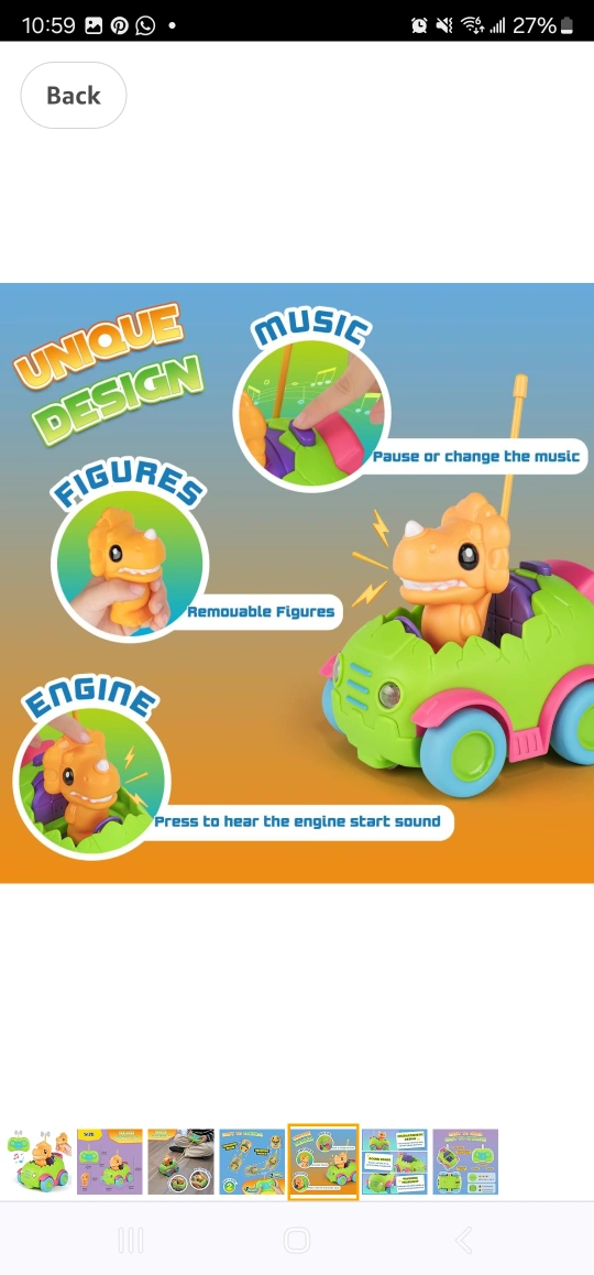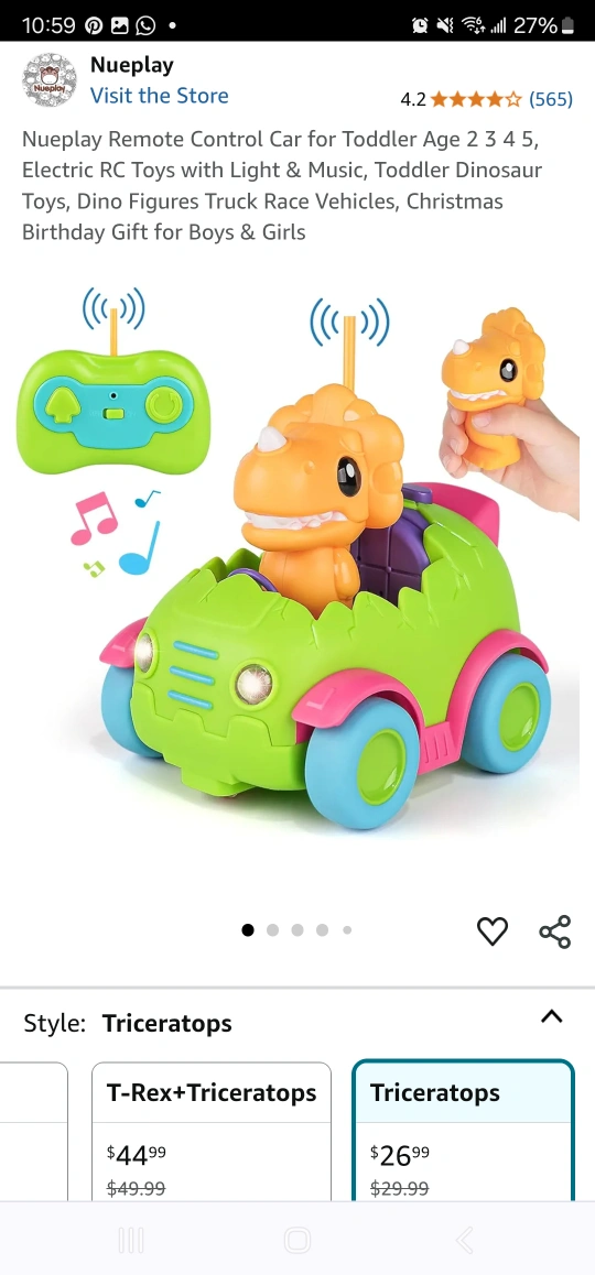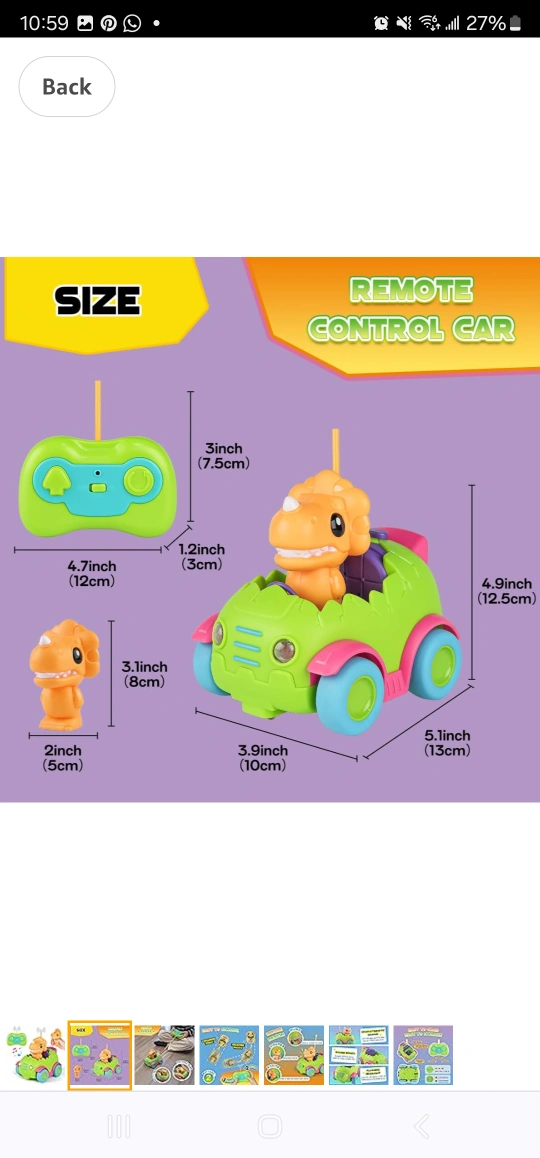 Remote control dinosaur car. Features lights and music. Removable dinosaur figure. Suitable for toddlers aged 2+. Triceratops style.