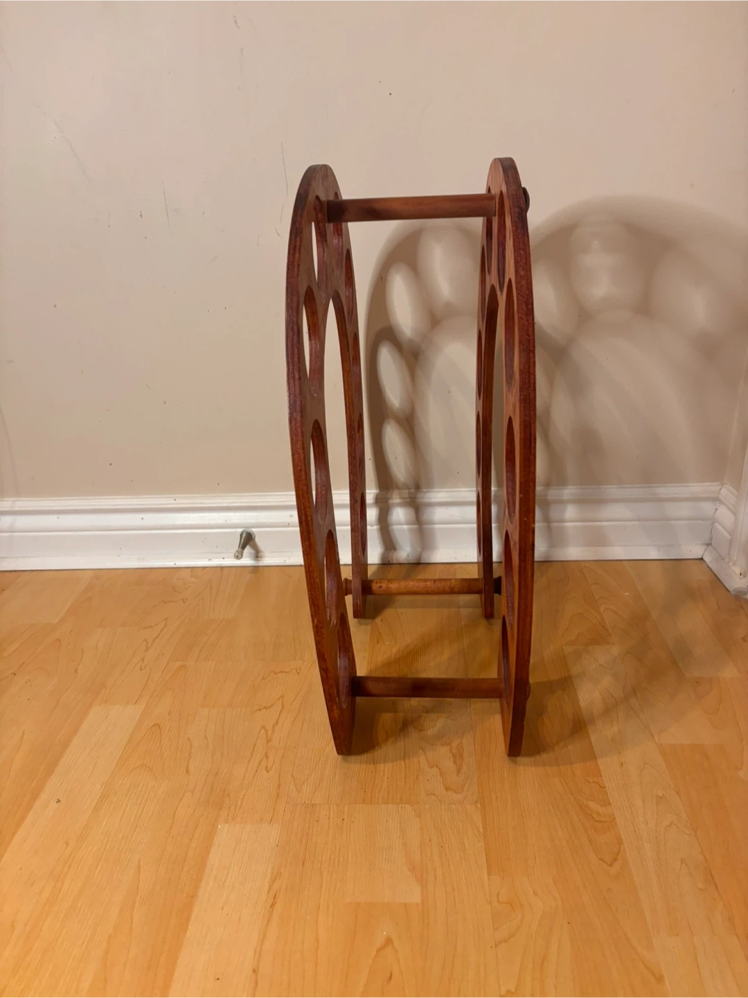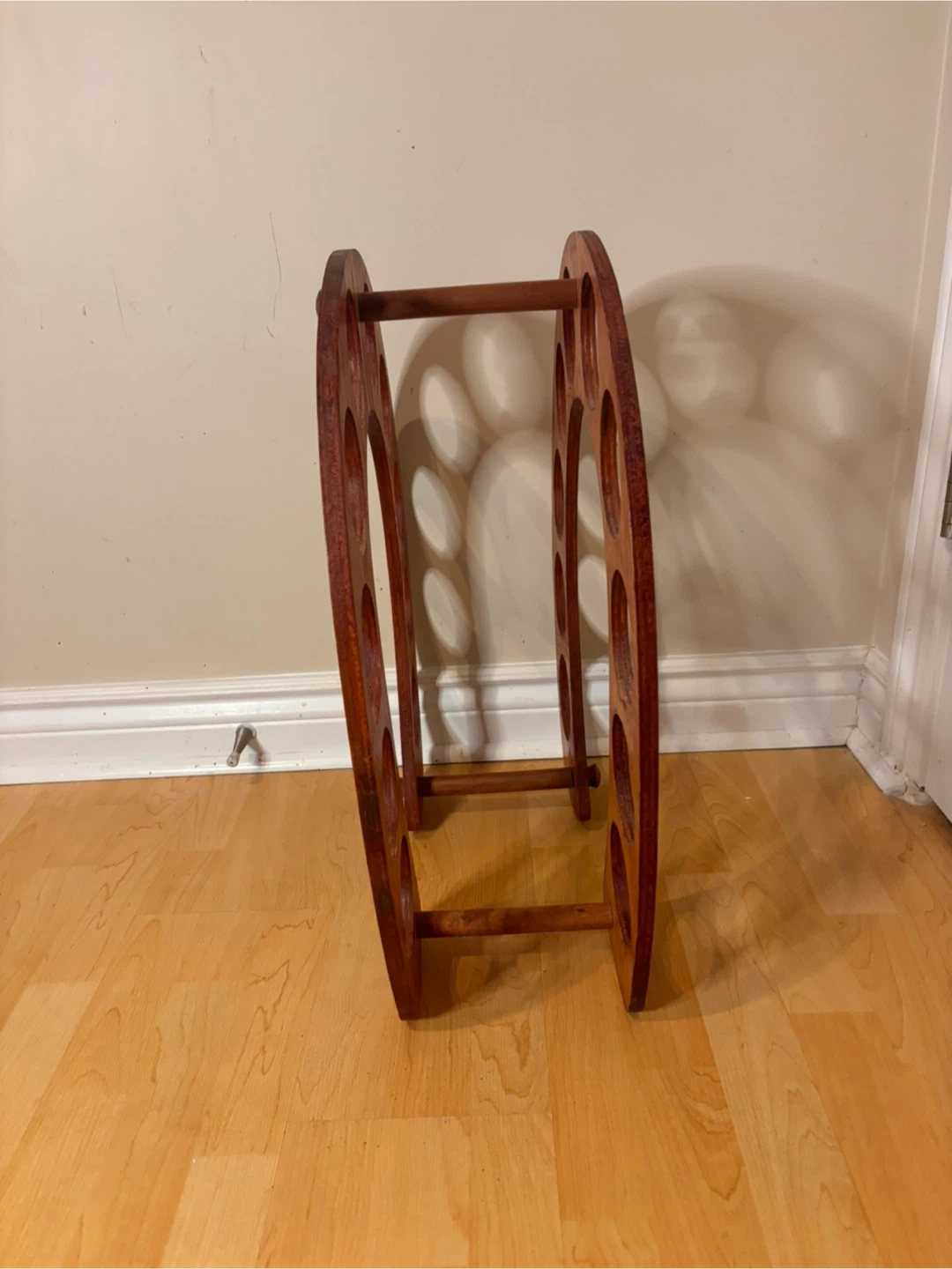 Unique horseshoe-shaped wine rack crafted from solid wood with a rich natural grain. Designed to hold multiple wine bottles while also serving as a decorative statement piece. Sturdy, well-made, and perfect for a bar area, dining room, cottage, or wine lover’s space.