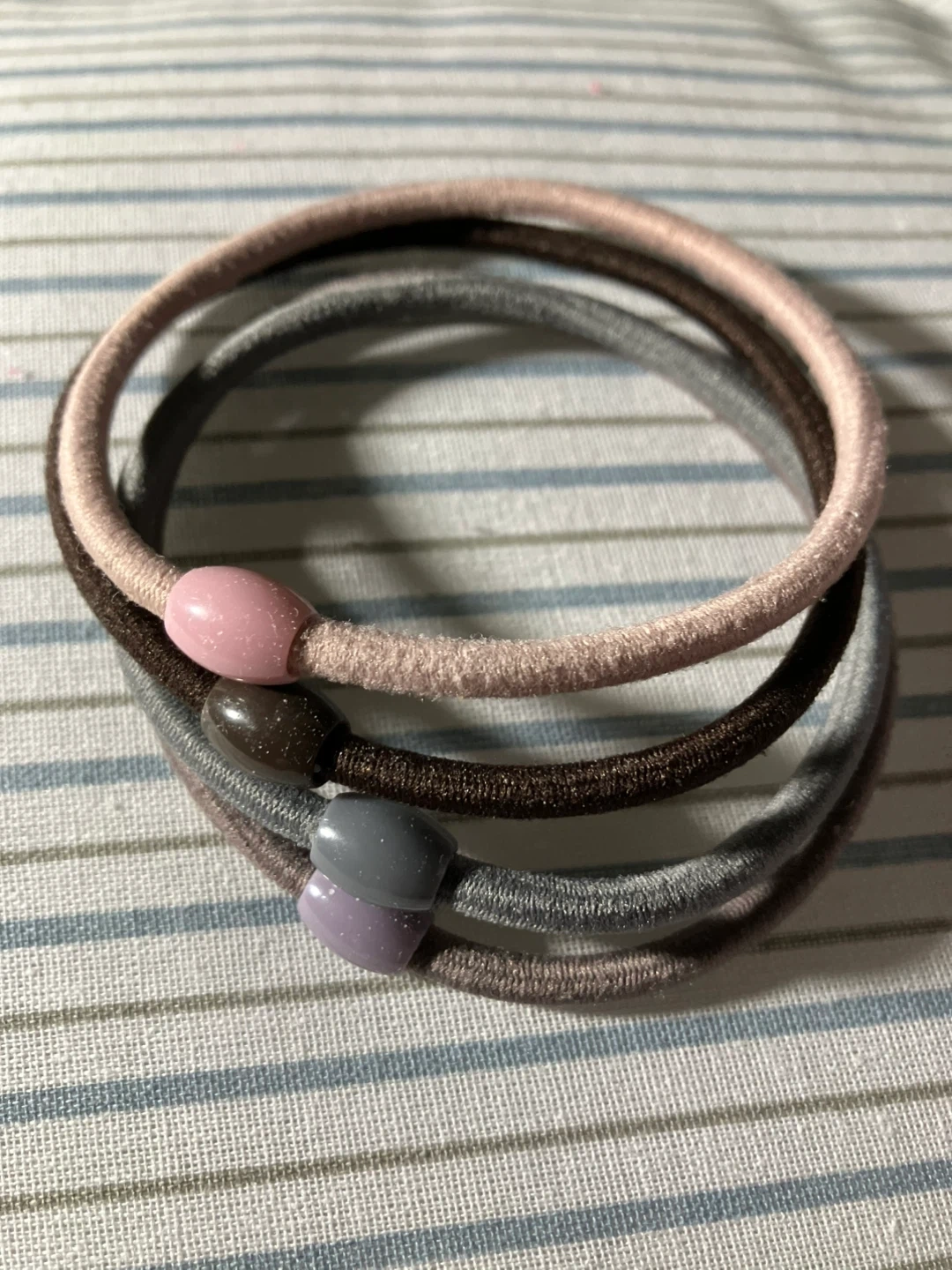 This set includes four fabric hair ties. Two hair ties have solid beads in pink and grey, and two have speckled beads in dark brown and light purple. They're great for keeping hair in place!