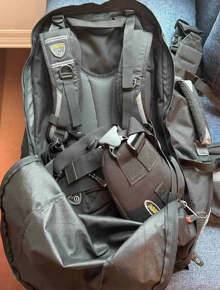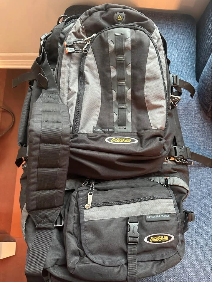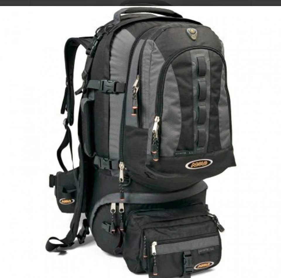 Zip off day pack and fanny pack / shaving kit. Zip off divider. Storage pockets and packing aids in main compartment. Internal frame. Rain & travel cover. Shoulder strap. Padded handle. Duffle bag strap. Full hide-away suspension system. Deluxe padded hip belt with handy storage pocket. Duo hip belt for easy adjustment. Asolo sliding torso-adjusting suspension. Full front panel access to main compartment. Main compartment with zipper divider. Interior organizer system in main compartment. Emergency whistle on sternum strap.