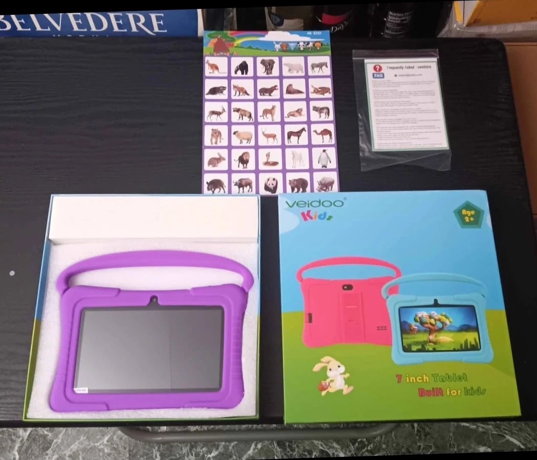 This Veidoo Android Kids tablet is built for children. It features front and back cameras and adurable design with a protective case and handle. Includes animal stickers and a user guide.