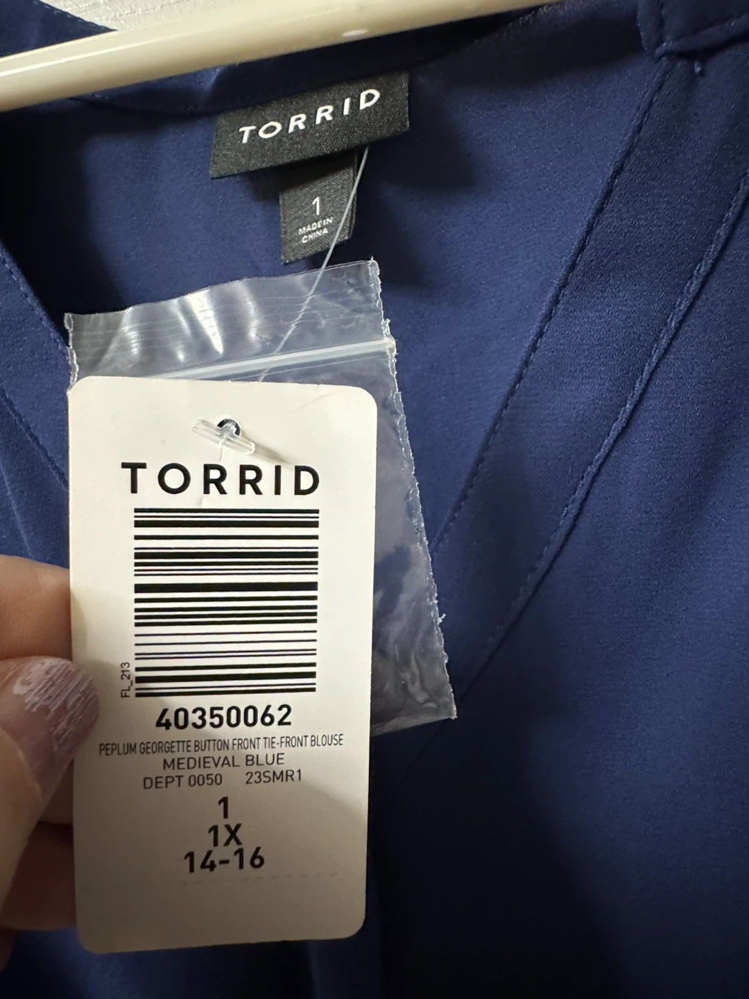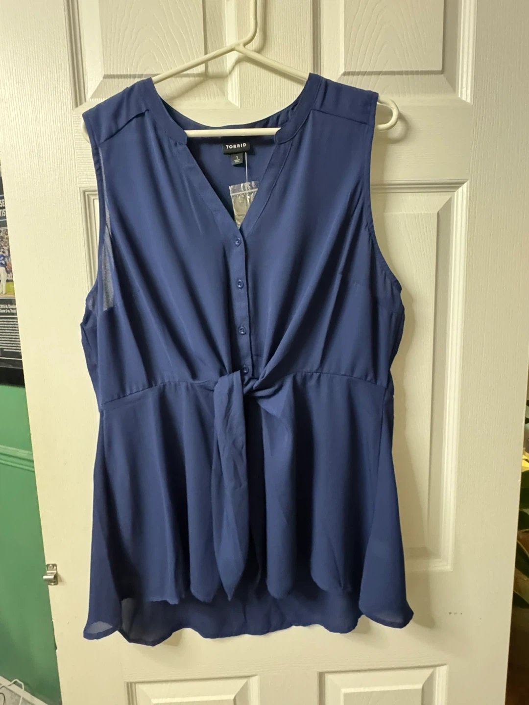 Torrid peplum georgette blouse in Medieval Blue. It features a button front and a tie-front detail. This sleeveless top has a flattering fit. Perfect for dressing up or down!