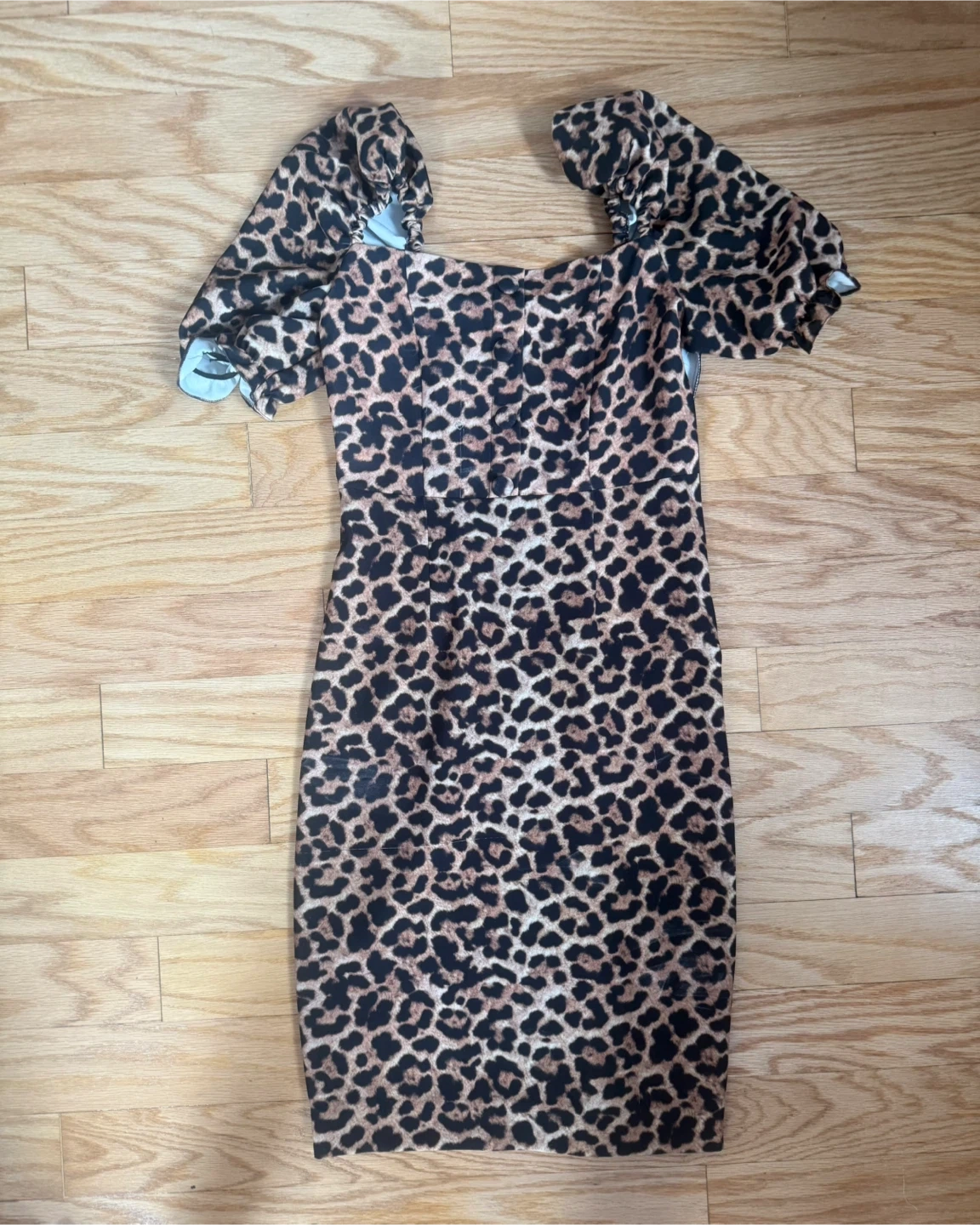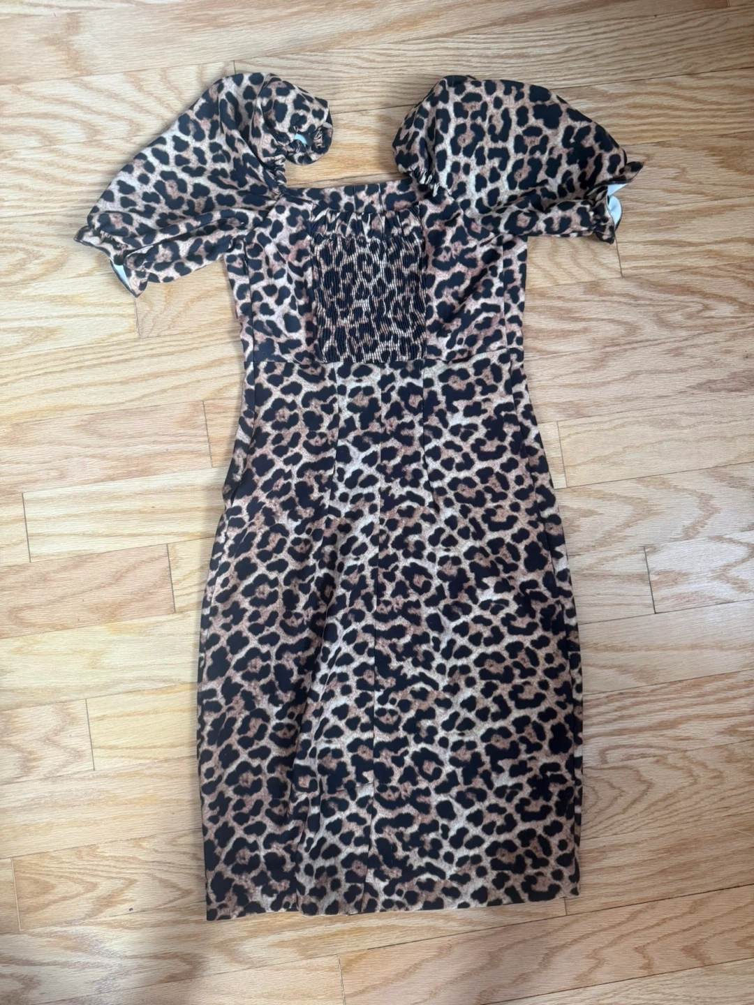 This dress features a bold leopard print with dramatic puff sleeves and a smocked bodice. It's a fitted silhouette that hits around the knee. Material appears to be a stretch knit.