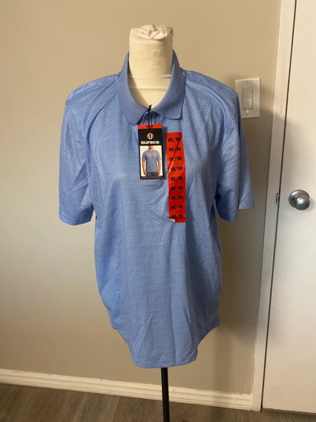 BNWT Sunice polo shirt is a size medium. It's a light blue colour with a repeating geometric pattern all over. This shirt's material is lightweight and breathable, suitable for active wear.