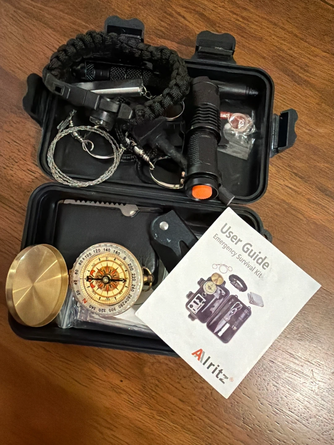 This is an Alritz emergency survival kit. It includes a compass, flashlight, and other survival tools in a compact case. The kit is designed for emergency preparedness.