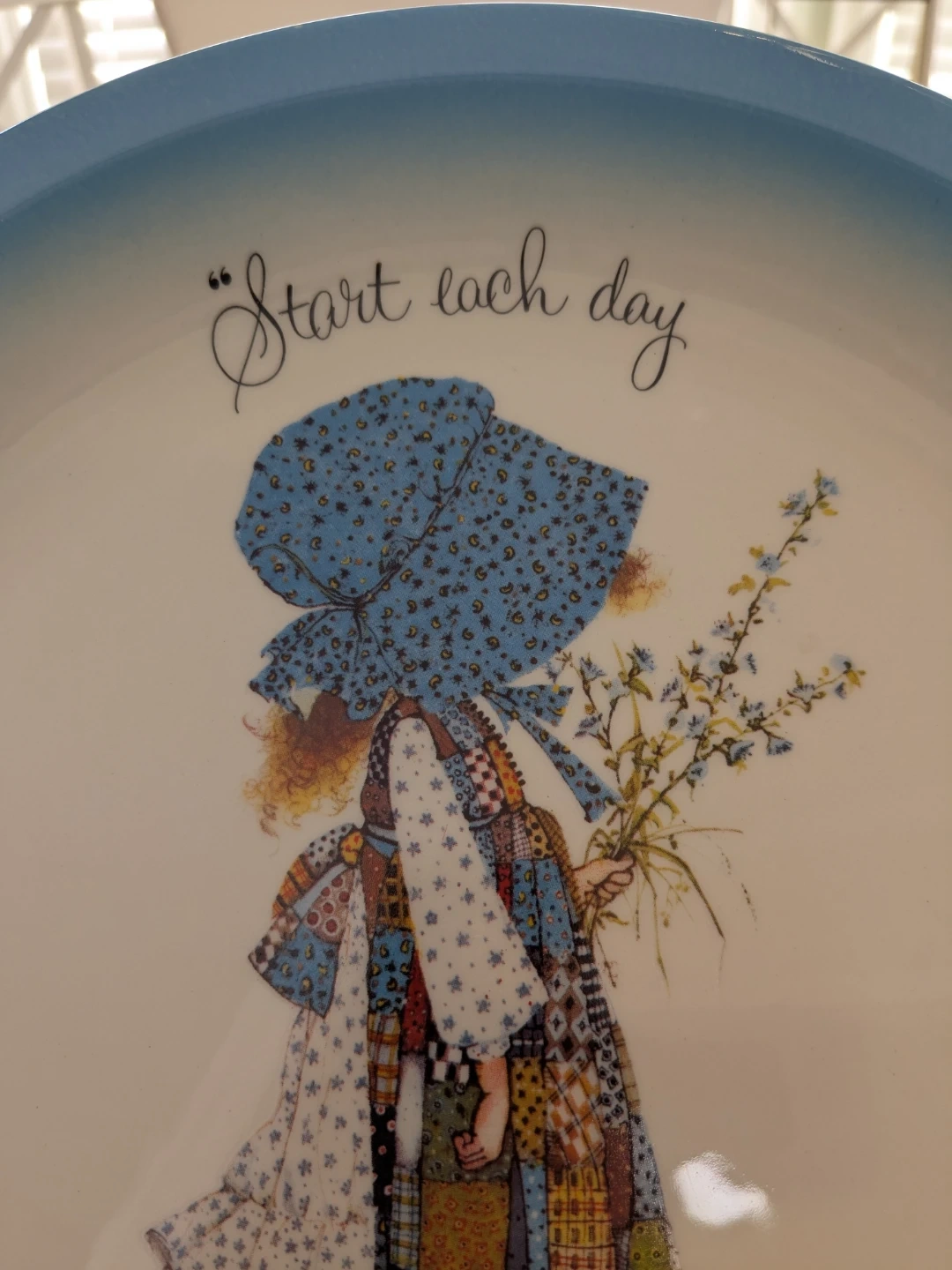 Decorative plate featuring Holly Hobbie's artwork. It reads 'Start each day in a happy way'. Ceramic material with a blue rim.