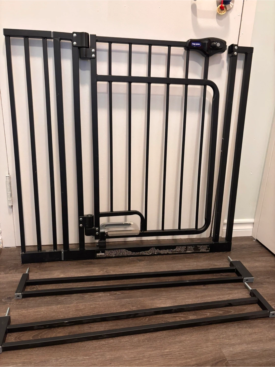 Black metal pet gate, 77 cm tall, includes (3) extension pieces.