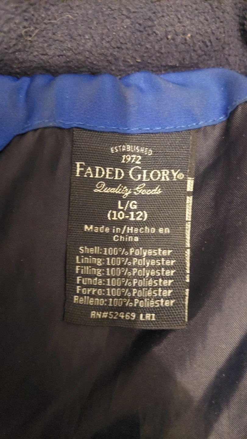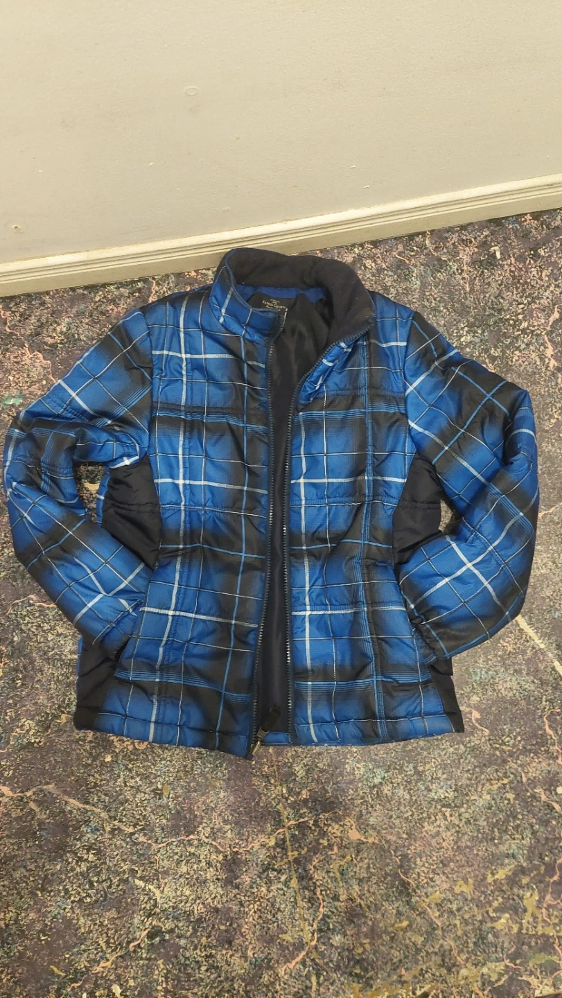 This jacket features a blue and black plaid design. It's made with 100% polyester for both the shell and filling. This jacket is Boys size L/G, which fits 10-12.