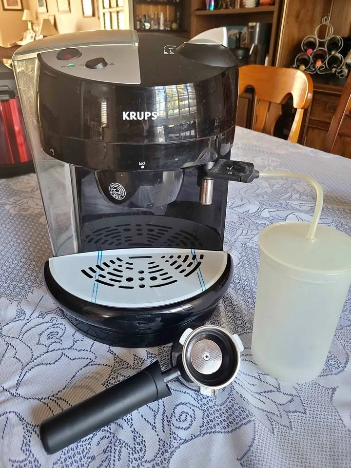 This KRUPS espresso machine was a gift. I've cleaned it up a bit but haven't tested it myself. I was told it was working well. It can use ESE pods or fresh ground coffee. The filter might need replacing as it's likely dried out from disuse, but if you use good espresso water, you might not need it. The stainless steel drip tray still has its protective plastic on, so it should be in perfect condition underneath! The manual is available online if you'd like more information. Asking $40 or best offer. I have other coffee gear listed too.