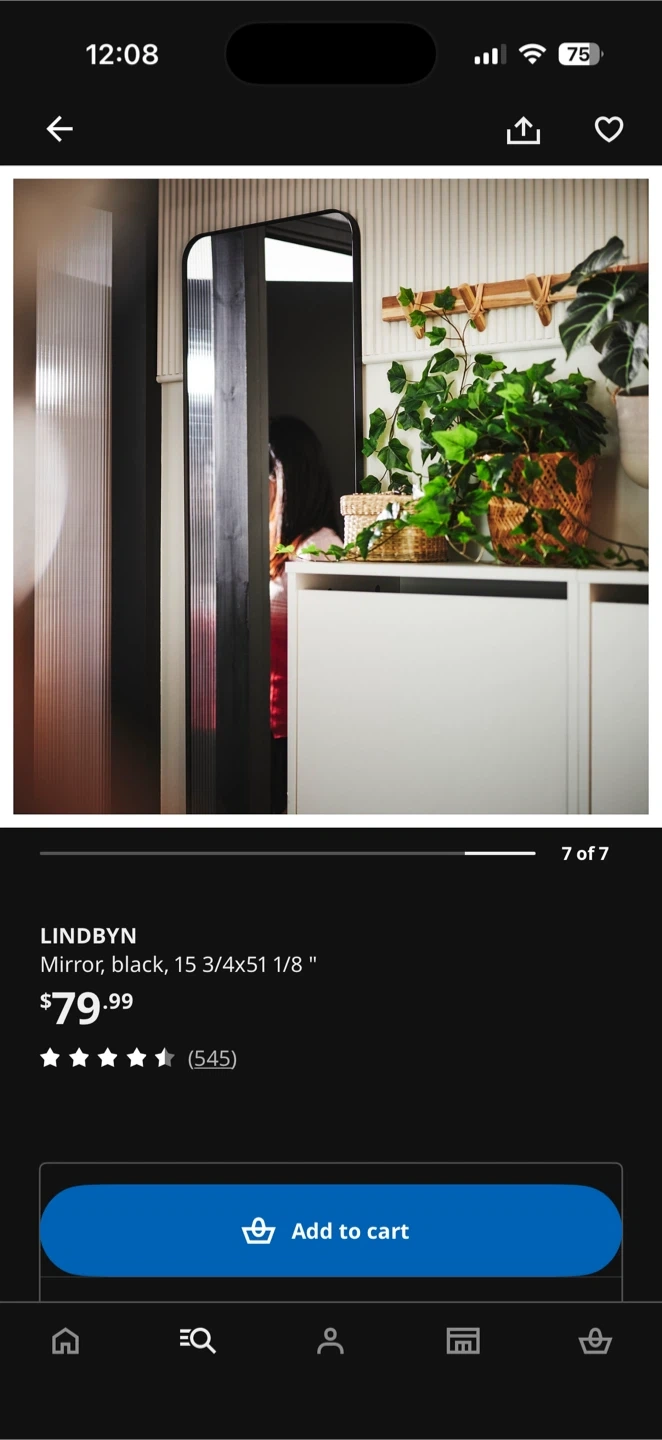 This is an IKEA LINDbyn mirror in black. It's a full-length mirror with a sleek, rounded frame. Dimensions are 15 3/4 inches wide by 51 1/8 inches tall.