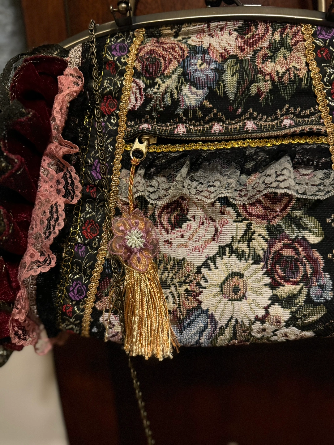 This is a vintage handbag with a floral print and gold detailing. It features a top handle and a clasp closure. It is made of a tapestry fabric and has a tassel on the zipper.