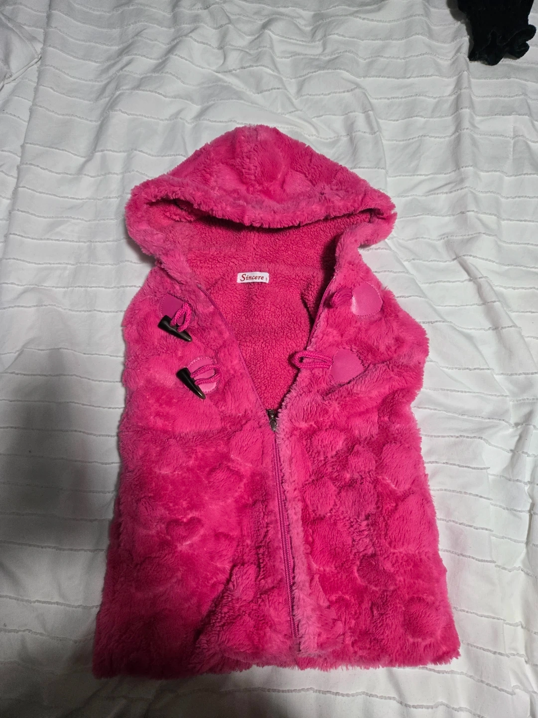 A cozy pink hooded fleece vest from Sincere. It's got a soft, fuzzy texture with a full zip front and toggle closures. This vest is perfect for keeping little ones warm on cooler days!