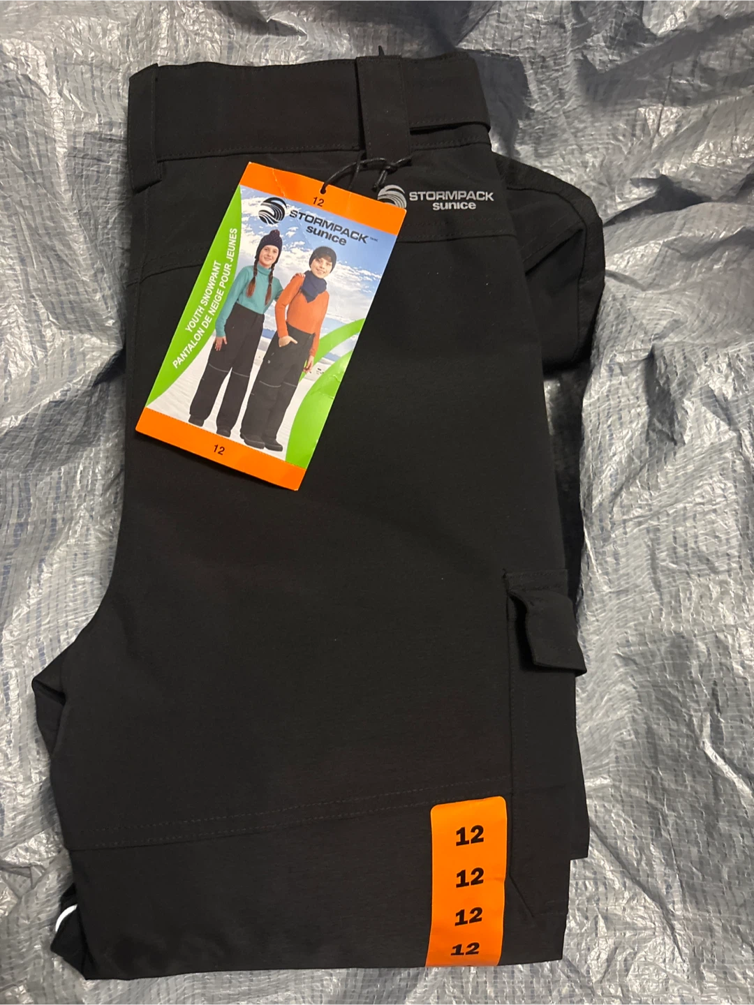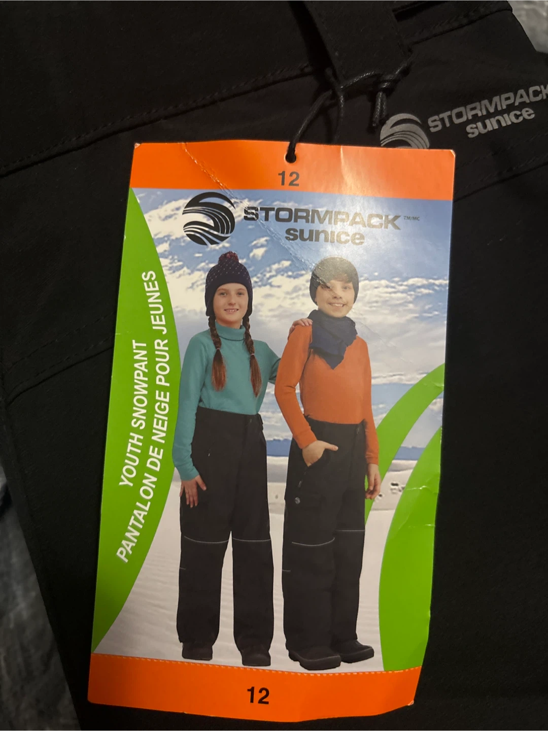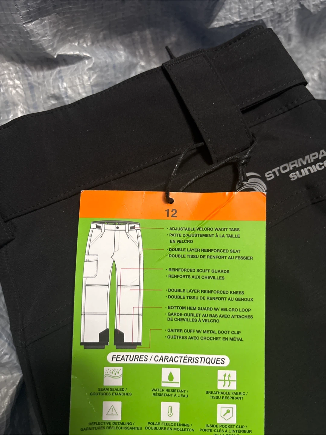 Brand new with tags, Stormpack Sunice youth snow pants in size 12. These black snow pants feature adjustable Velcro waist tabs and a double-layer reinforced seat. They also have reinforced scuff guards and double-layer reinforced knees. The bottom hem guard has a Velcro loop, and the gaiter cuff has a metal boot clip. They are water-resistant and breathable