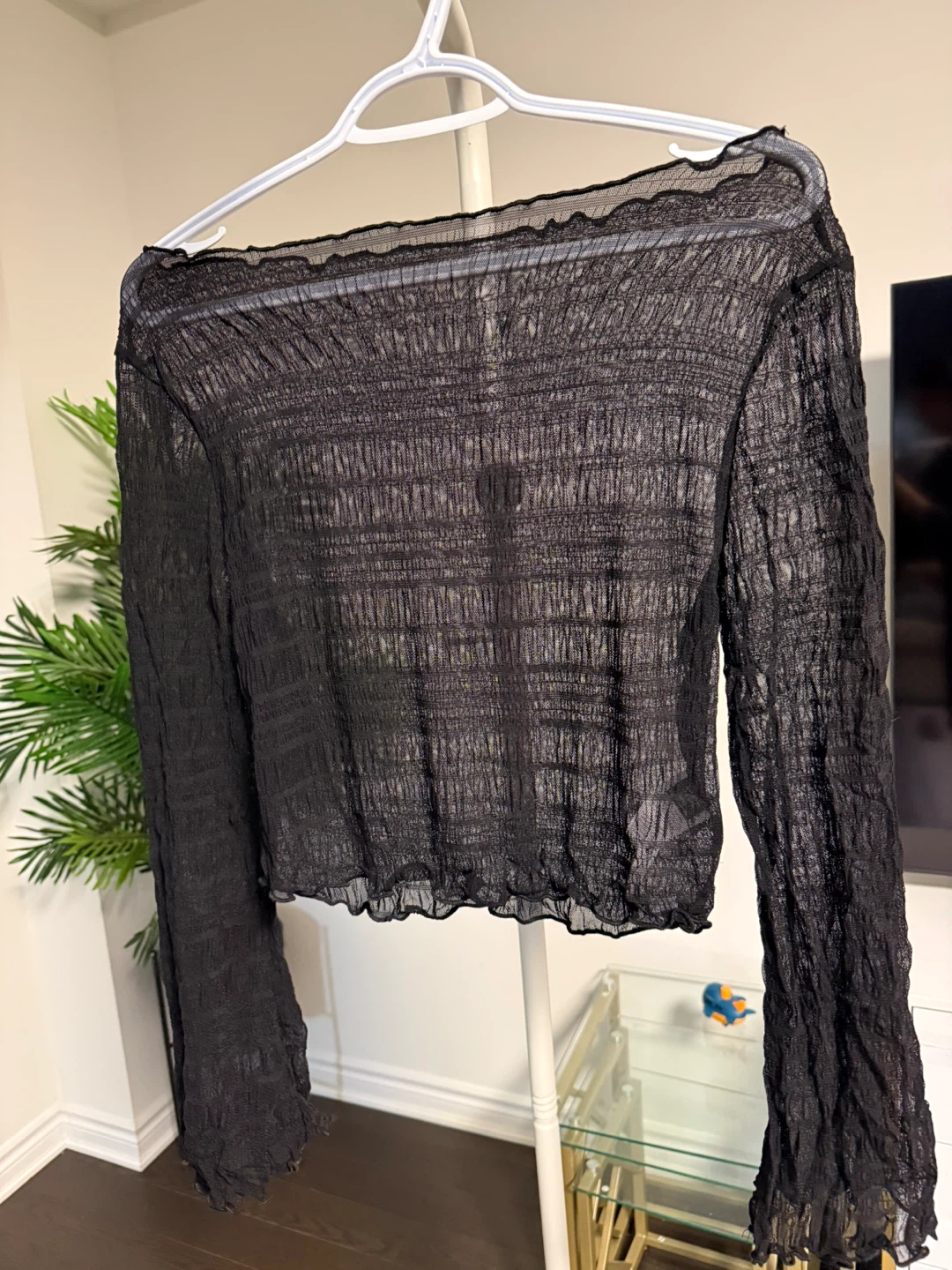 This black long sleeve top has a crinkled texture throughout. It features a ruffled neckline and hemline. The sleeves are also flared with a ruffled cuff. It's a sheer material.