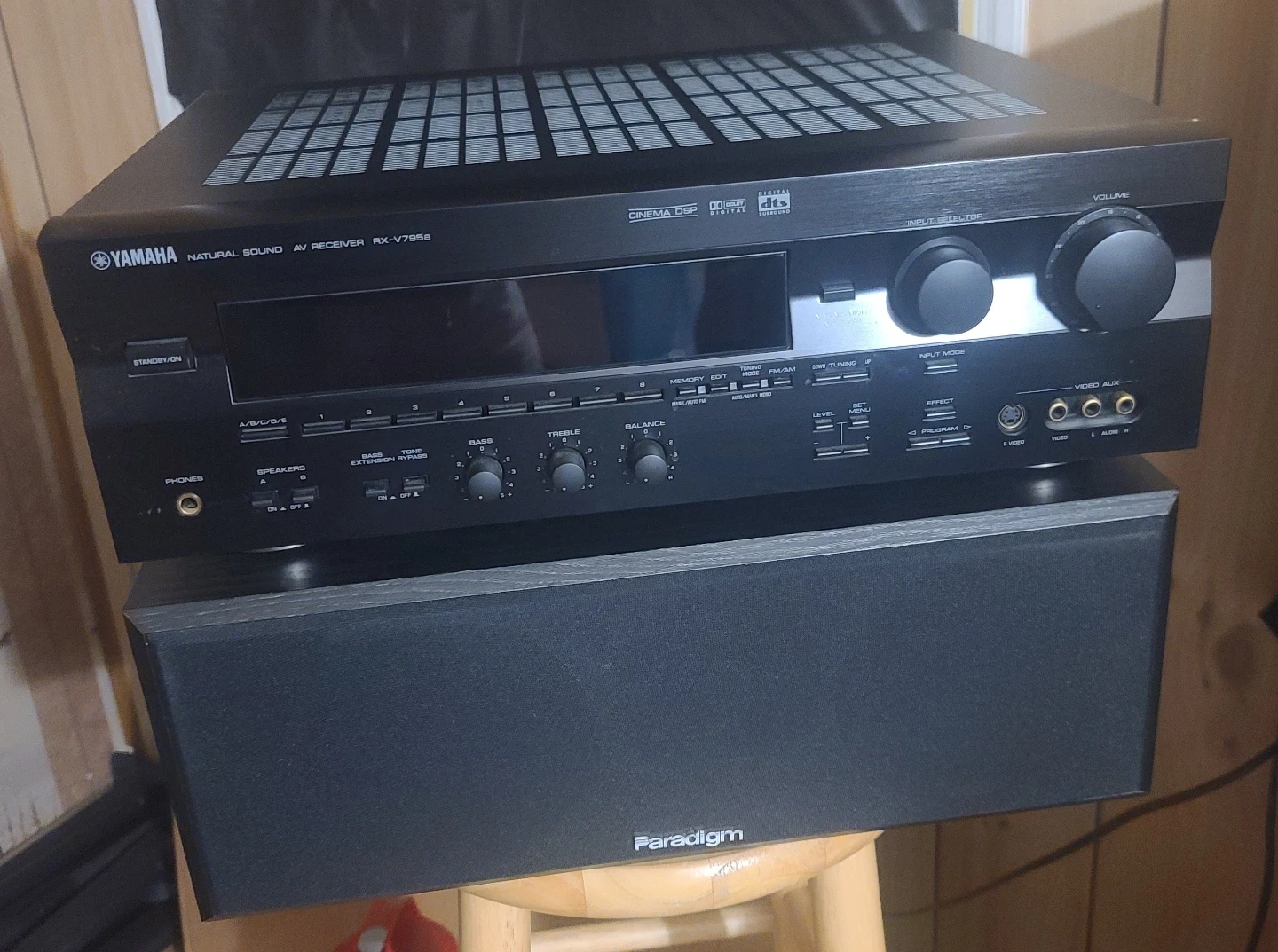 Yamaha Natural Sound AV Receiver RX-V7958. Features multiple input options and speaker outputs. Includes bass, treble, and balance controls. Great for setting up a home theatre system!
