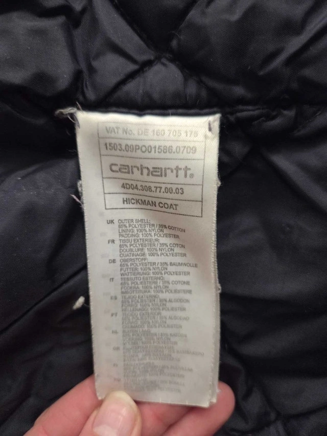 This is a Carhartt Hickman Coat, a durable and stylish jacket in size medium. The jacket features a sturdy outer shell and a quilted lining for added warmth. This jacket has some wear, but it's still in good shape for everyday use.