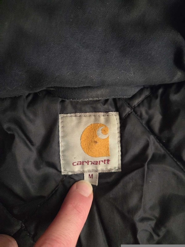 This is a Carhartt Hickman Coat, a durable and stylish jacket in size medium. The jacket features a sturdy outer shell and a quilted lining for added warmth. This jacket has some wear, but it's still in good shape for everyday use.