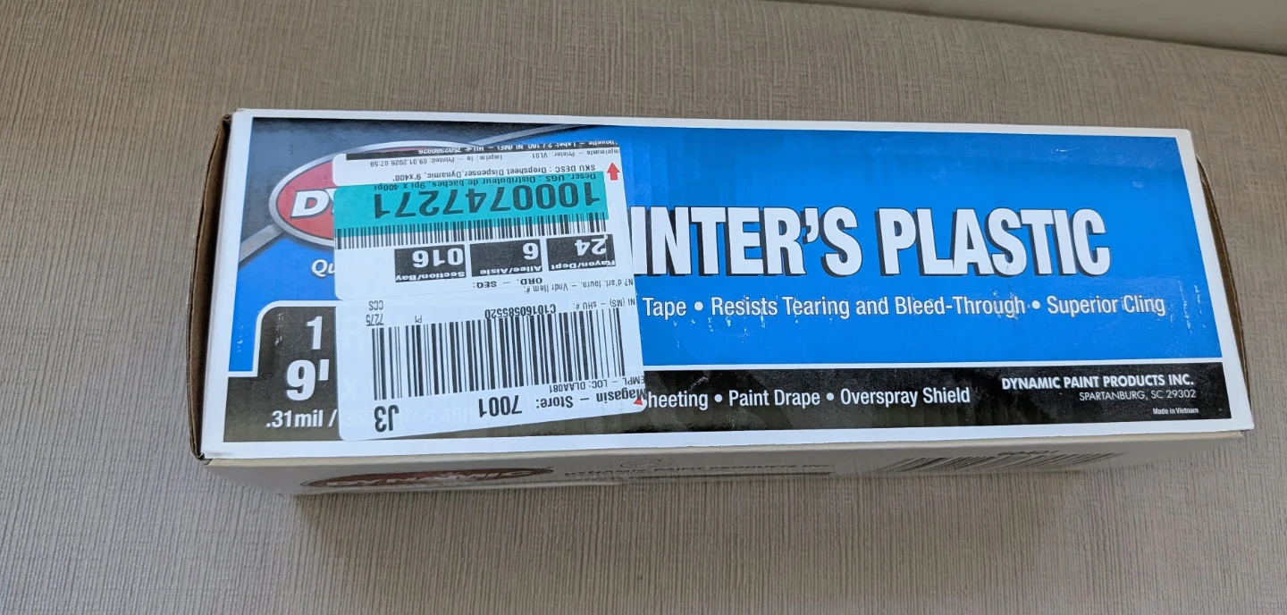 This Dynamic Painter's Plastic is 9 feet by 400 feet. It's designed to be easy to tape and offers superior cling. This high-density sheeting resists tearing and bleed-through.