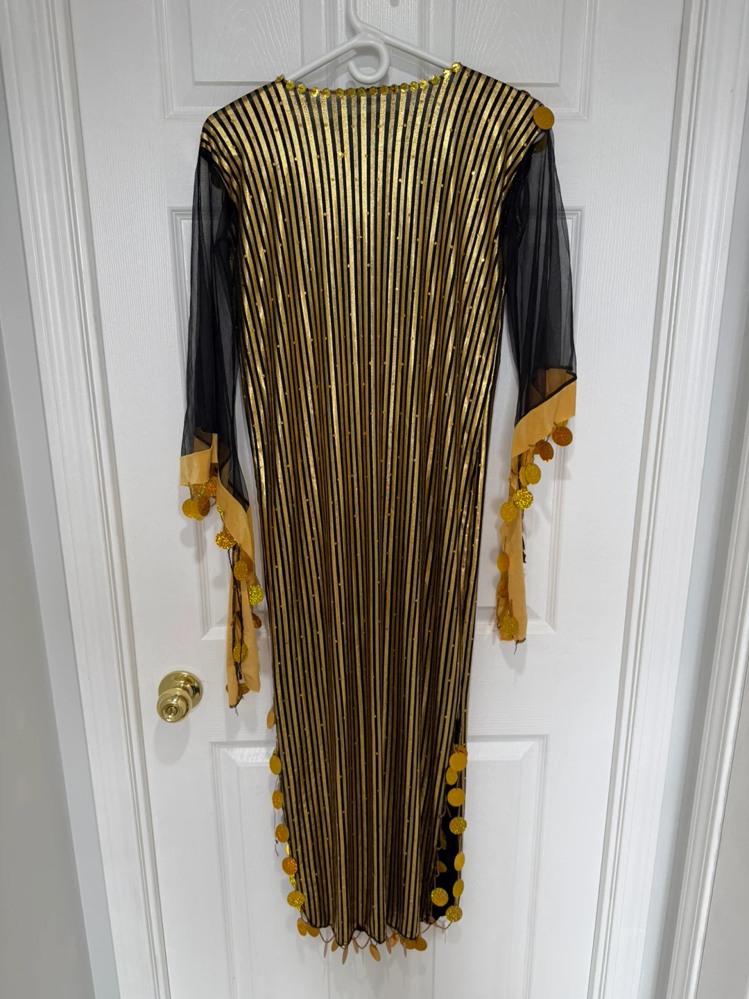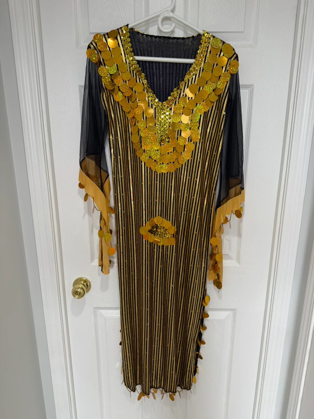 This long-sleeved kaftan dress is black and gold with vertical stripes and sequin accents. It features a V-neck and decorative gold coins along the hem and sleeves. The fabric is sheer and lightweight.
